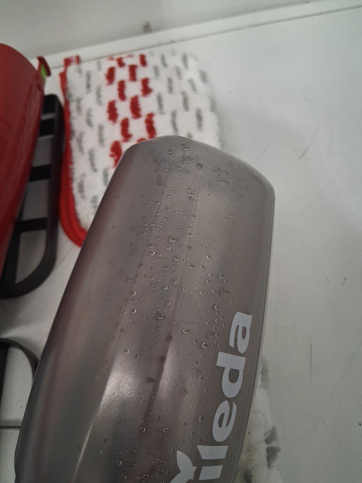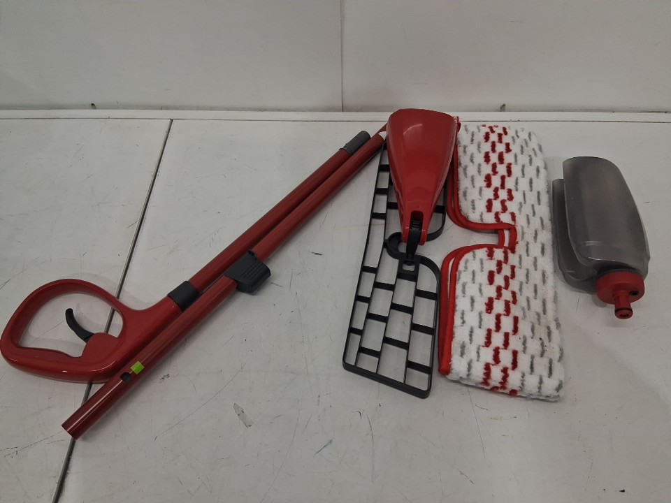 Mop head has light dirt discoloration and cannister has water drops inside