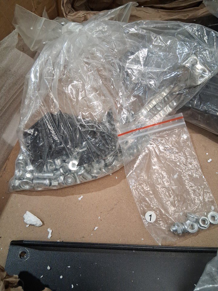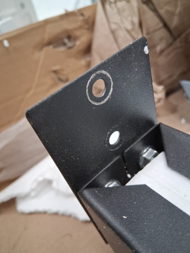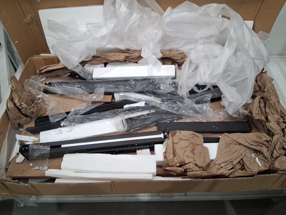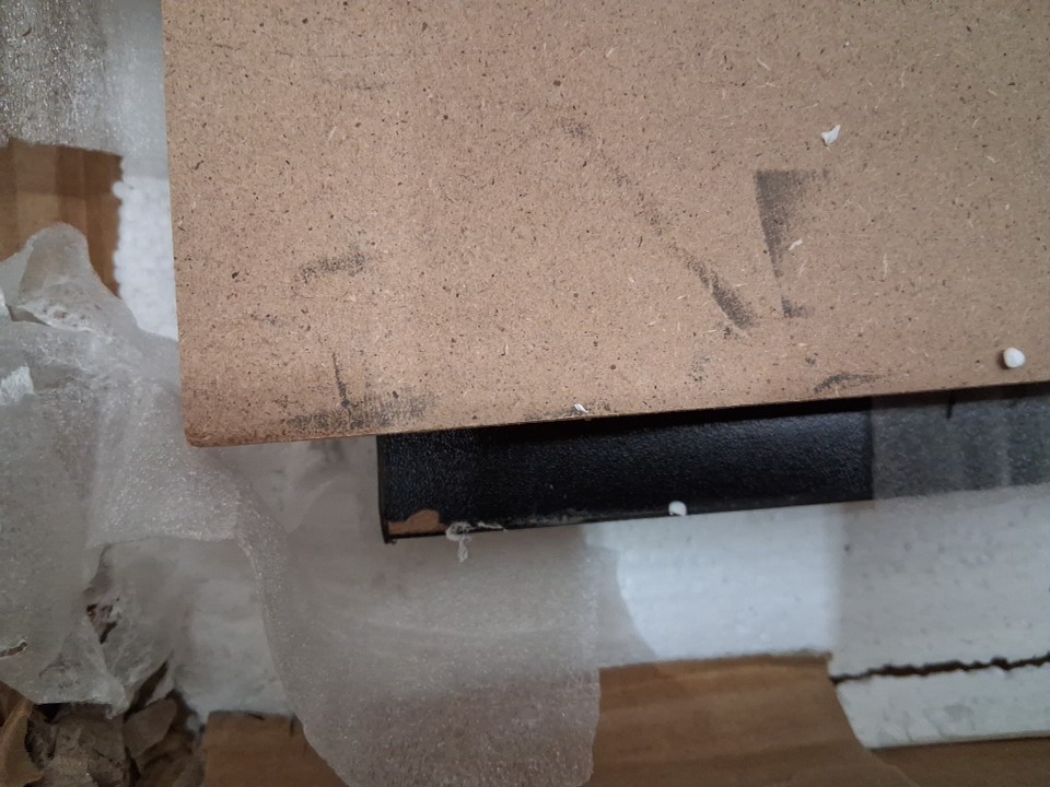 There are stress marks around many of the holes on the metal indicating previous assembly. Additionally, there are some scuffs on the shelves and some light chipping on one corner of the desktop, either due to previous assembly/handling or shipping - see photos. Outside of these cosmetic blemishes, all parts appear present without any significant damage or issues, though customer may need to provide some additional hardware (screws, etc) in order to complete assembly as some may have gone missing during shipping.