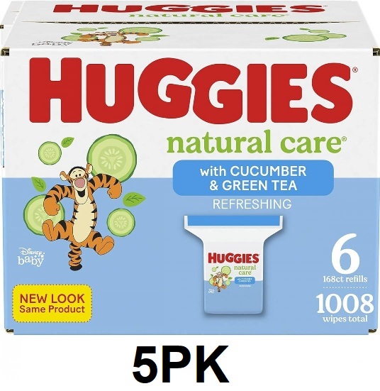 5pk huggies natural care refreshing plant based scented baby wipes - 168 per pack ( 840 wipes total) - cucumber & green tea scented (model: 50111)