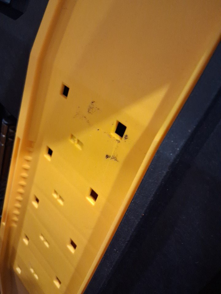 There is damage in the yellow and black area, there is some scuff marks on the product from previous use. See Photos attached.