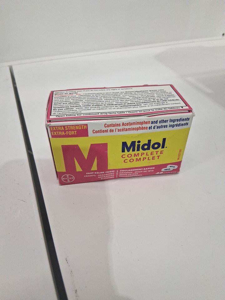 (40 CAPS) MIDOL extra strength COMPLETE MULTI-SYMPTOM RELIEF OF CRAMPS, BLOATING, HEADACHEs, AND BACKACHEs