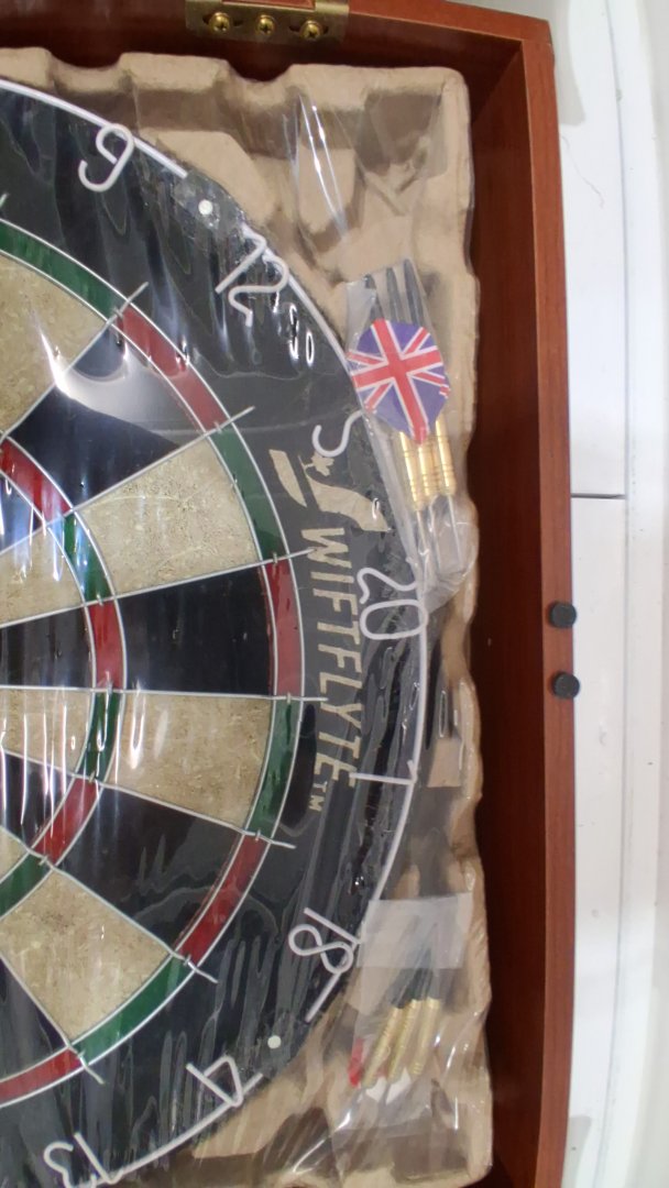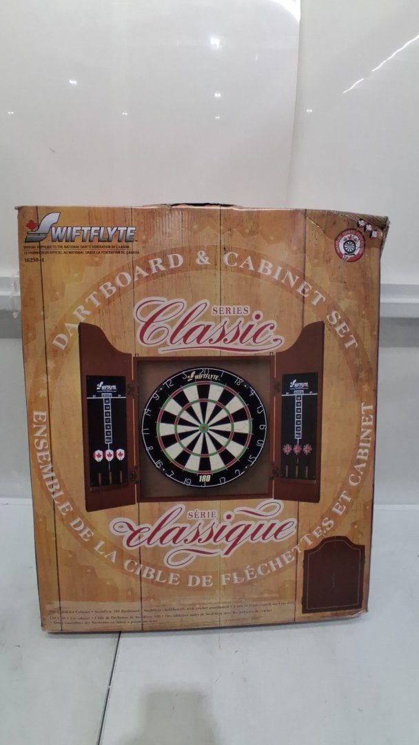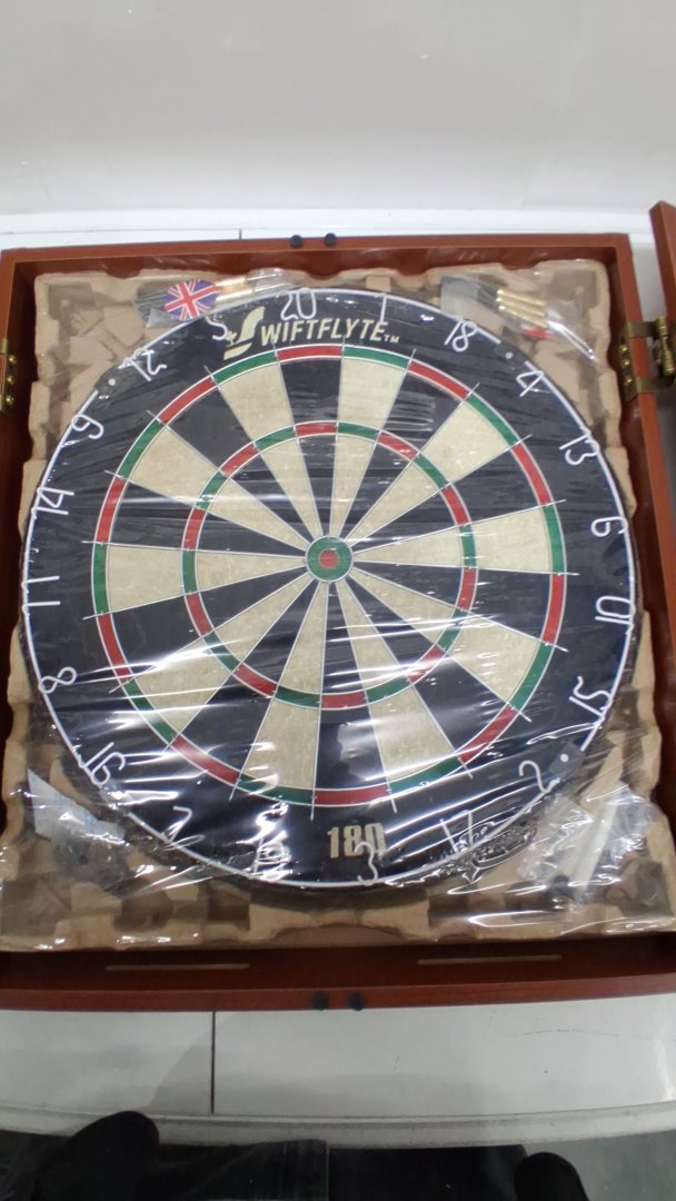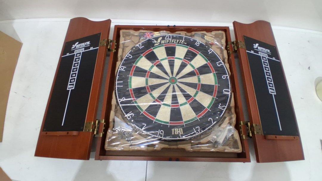 SWIFTFLYTE SERIES CLASSIC CABINET & BRISTLE DARTBOARD SET WITH STAPLE FREE BULLSEYE INCLUDES 2 BRASS STEEL TIP DART SETS - brown/multicolour (MODEL: 16230-4)