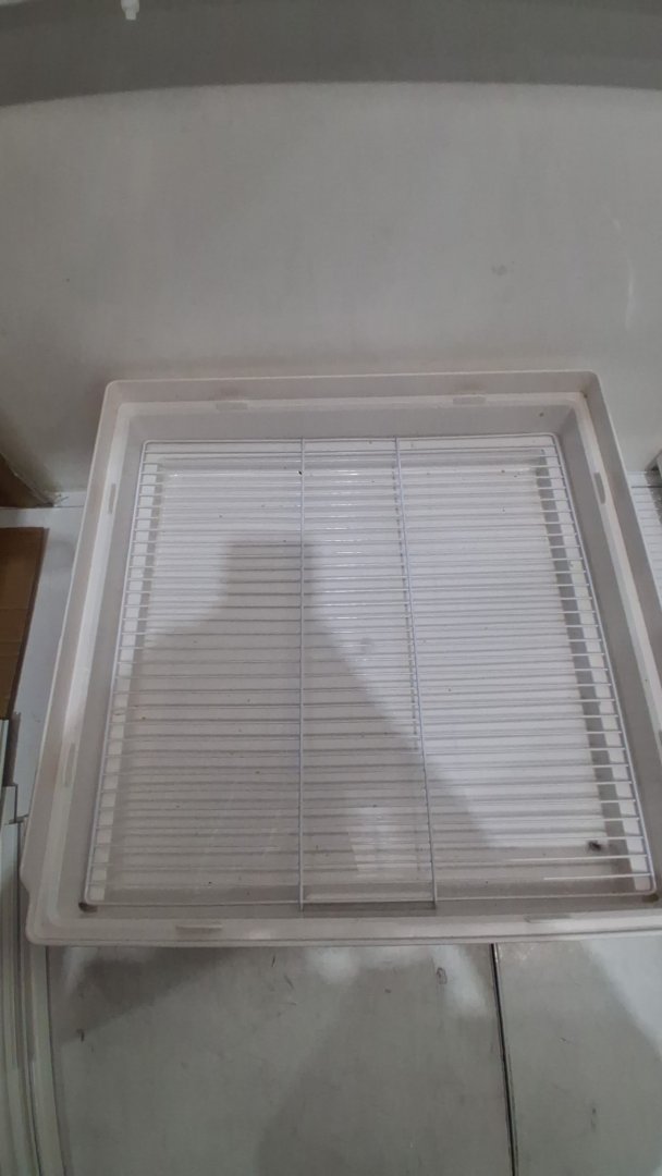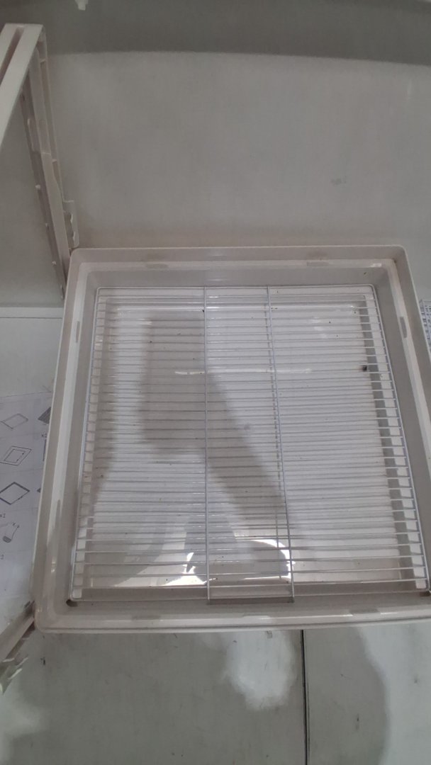 Dirty, used, missing the perches and food containers.