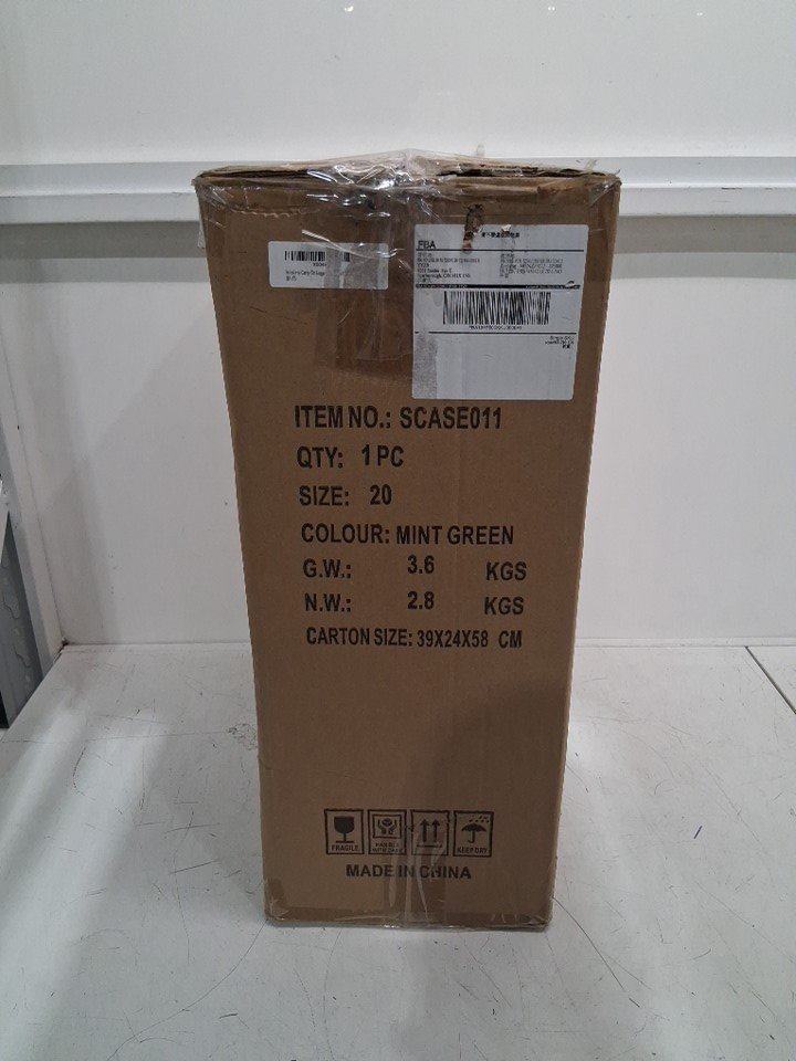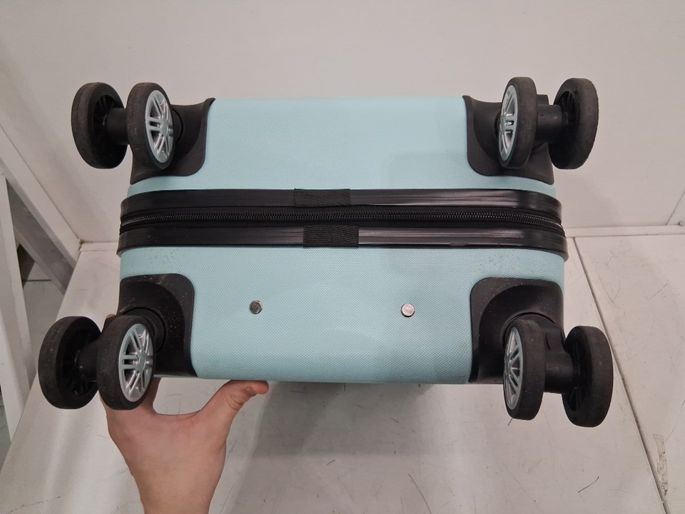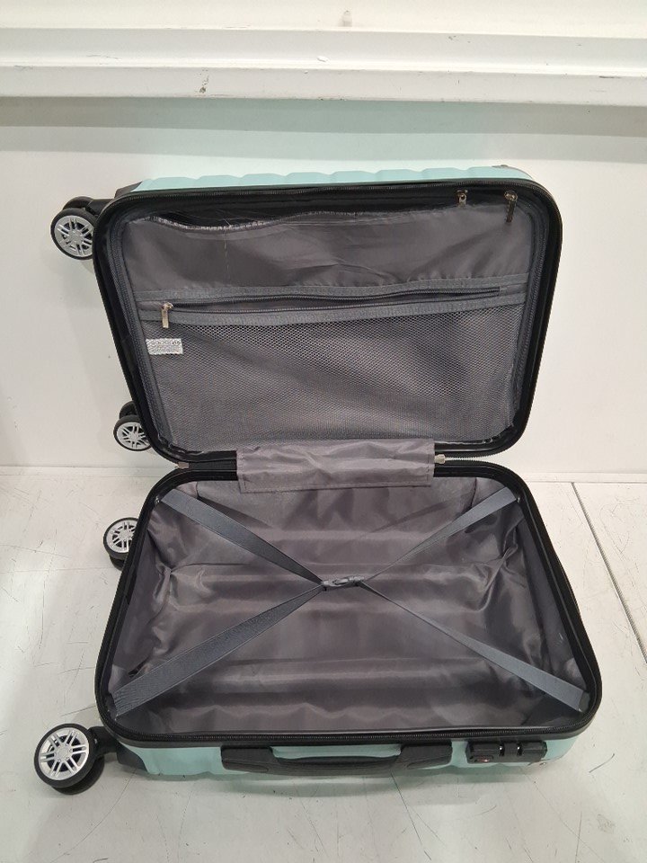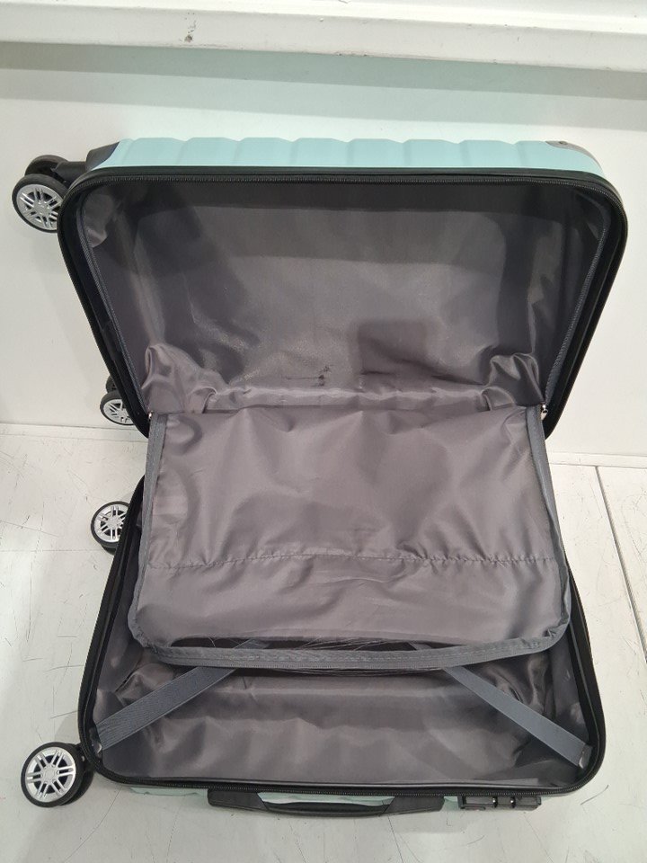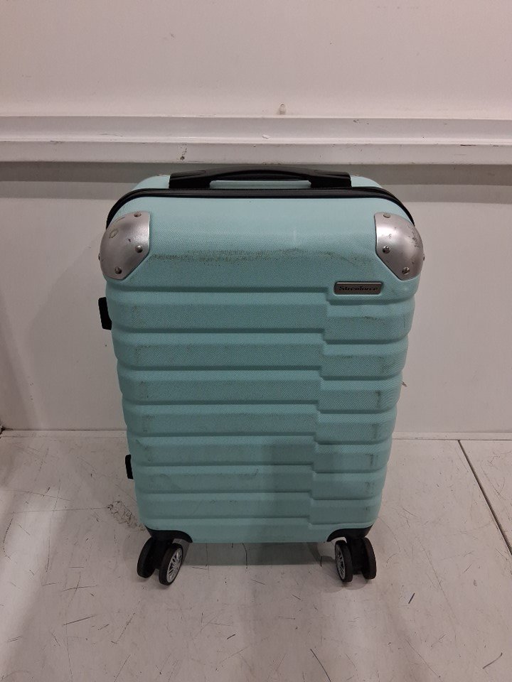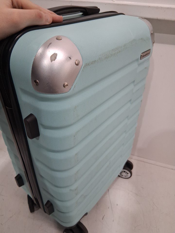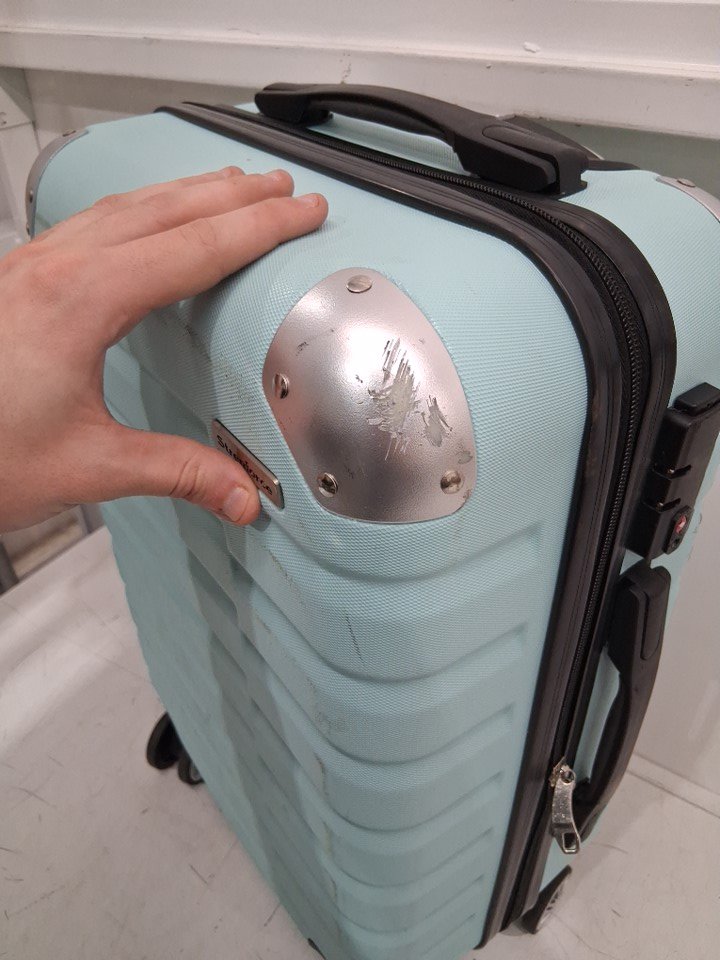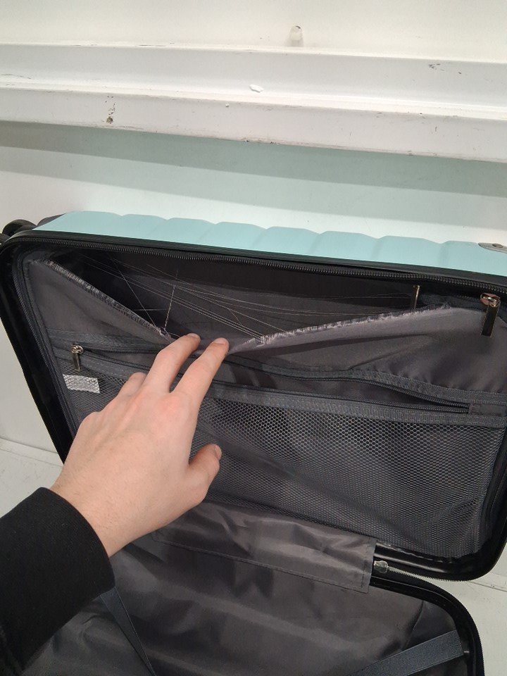 The suitcase has a decent amount of stains/scuff marks on it from being previously used. The suitcase also has a fabric pocket on the inside that has been ripped during previous use, it may be able to be sewn back together. (Please see photos)
