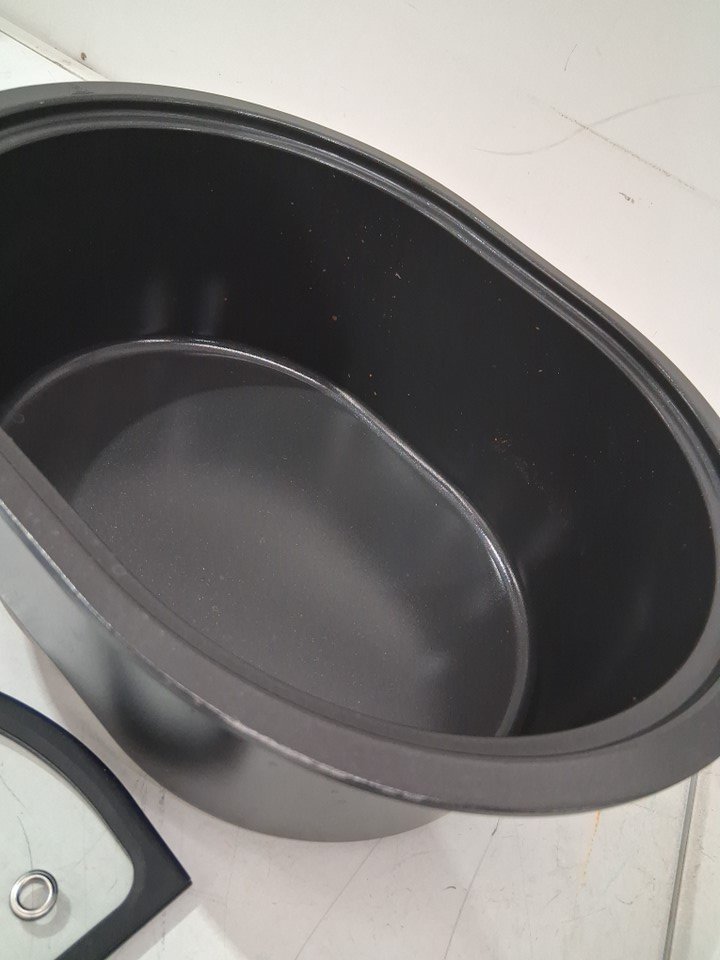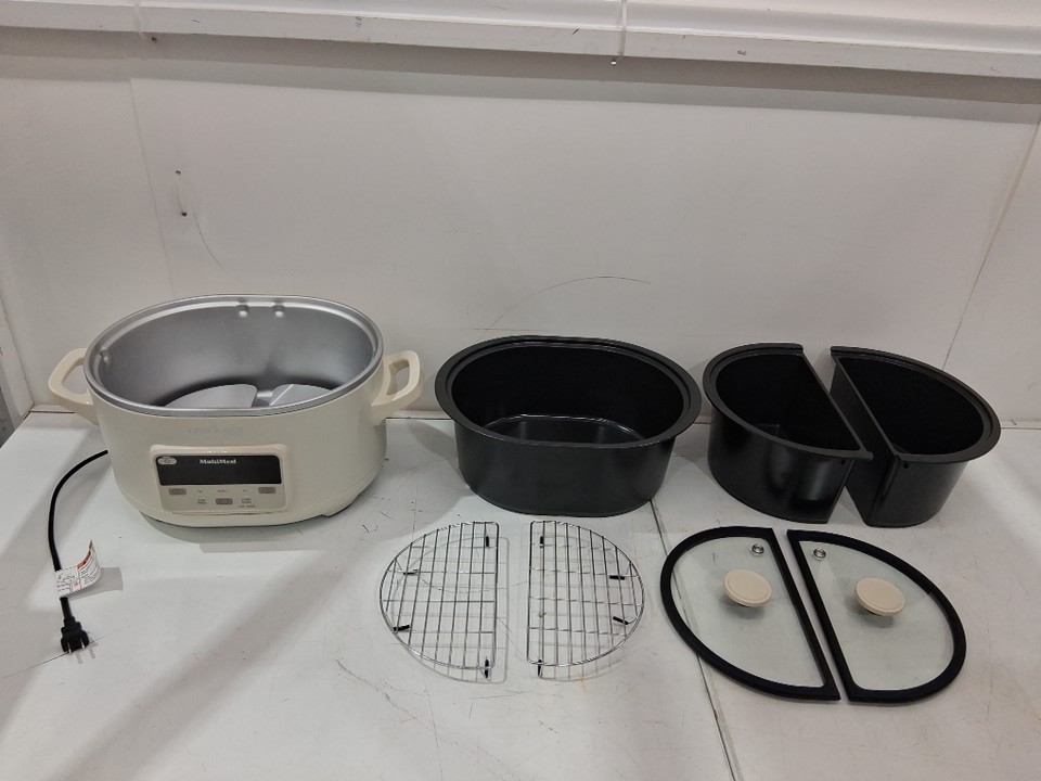 Item has food/oil residue and the coating coming off along the rim of the large cook pot. See photos. Tested power.