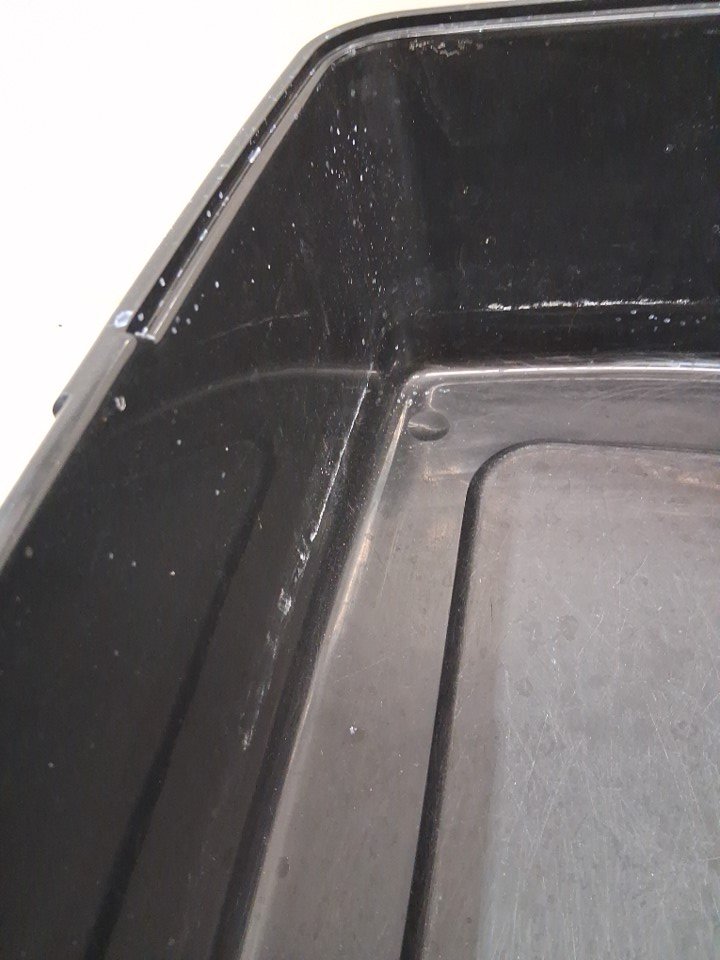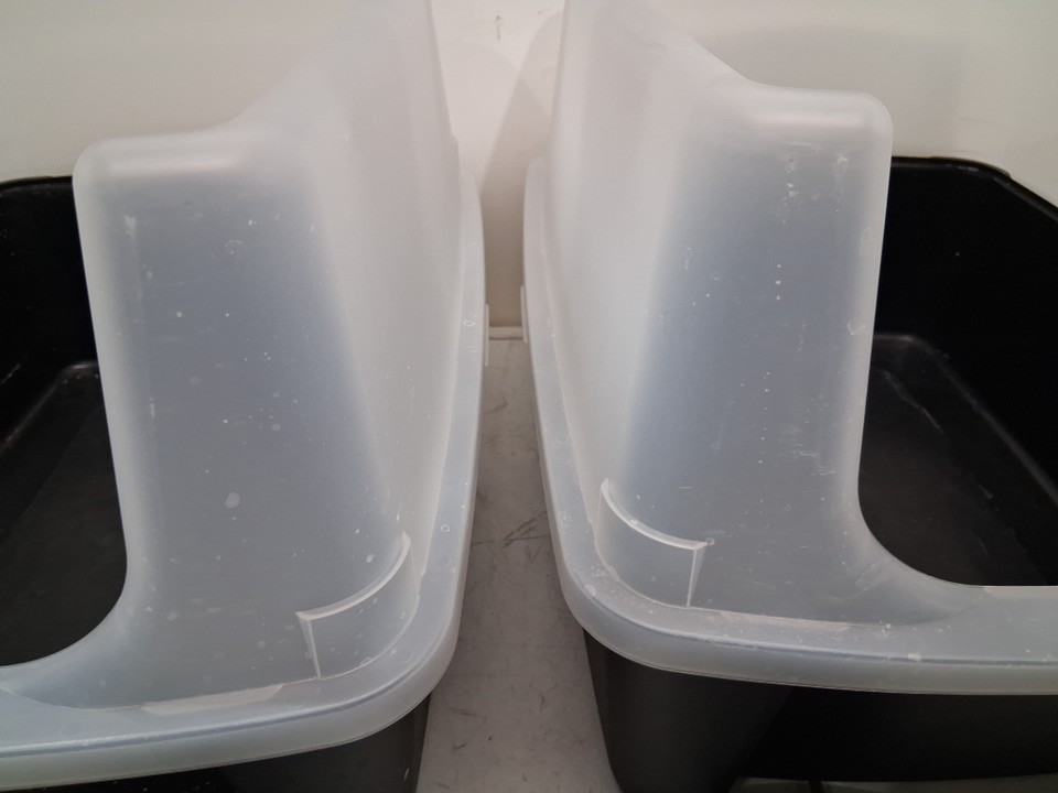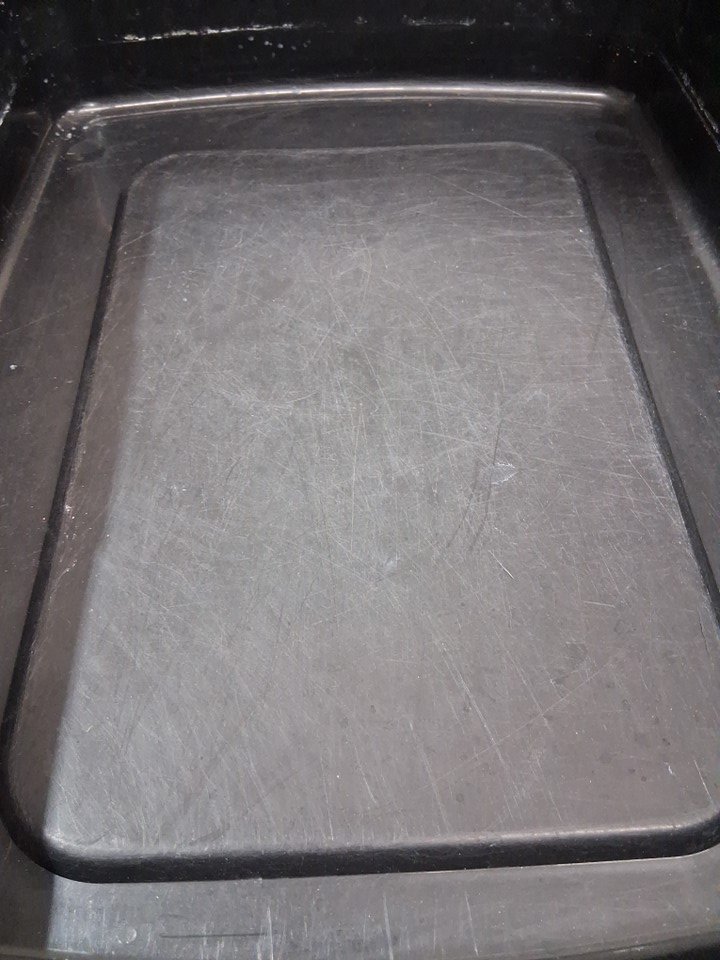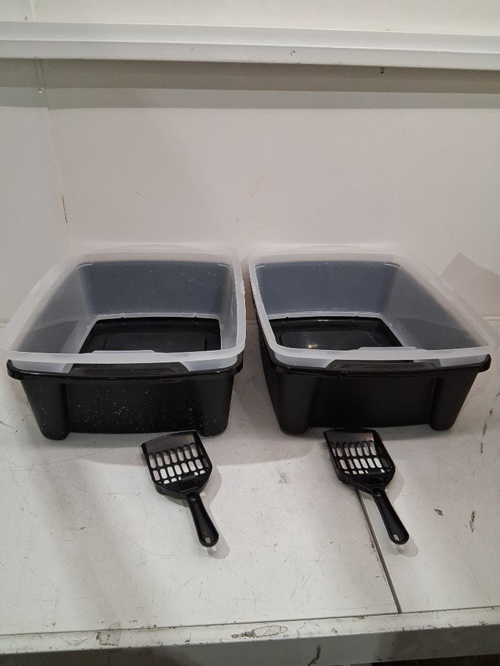 both pans have some litter dust residue as well as smell like litter and have some scratches on the bottom of the pan from previous light use