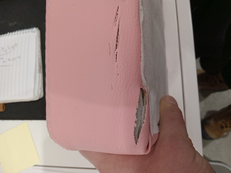 the ergonomic pillows are missing there are some marks on the back of the backrest and some small cuts to the foot stool, please see photos