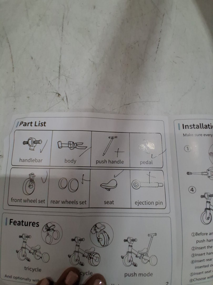 Item is missing the push handle, rear wheels set and the ejection pin.