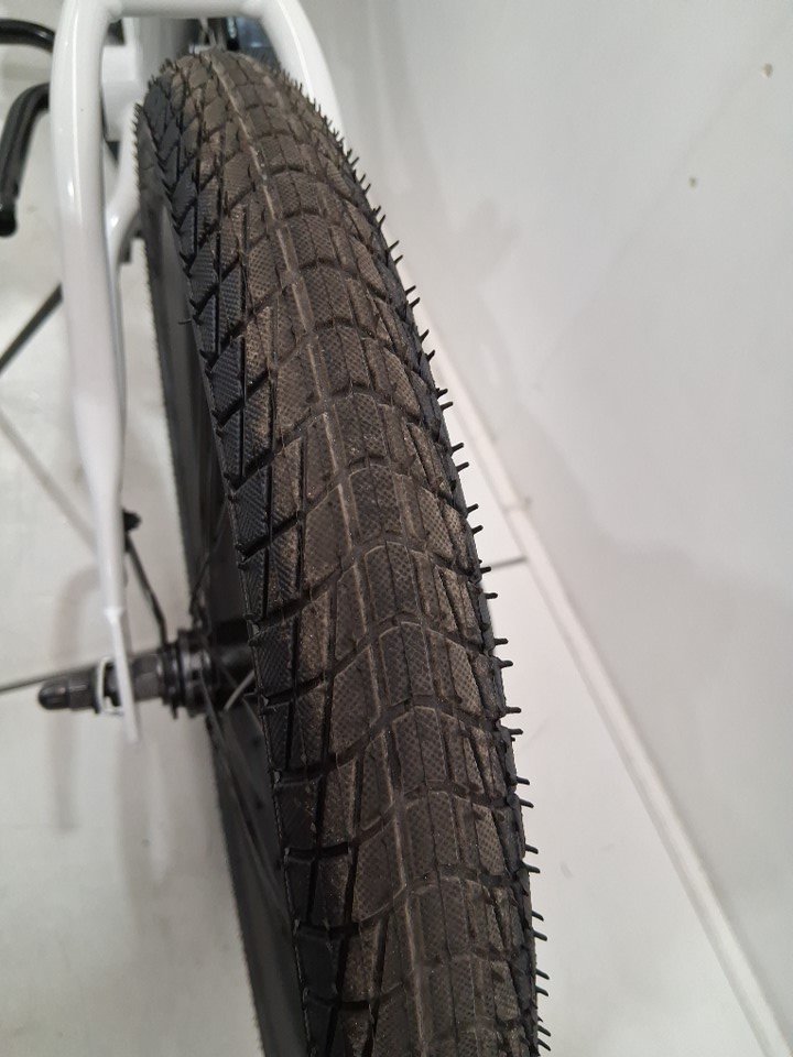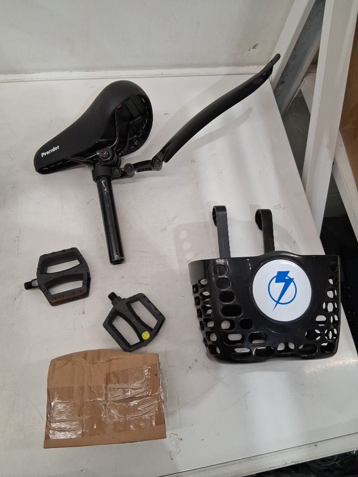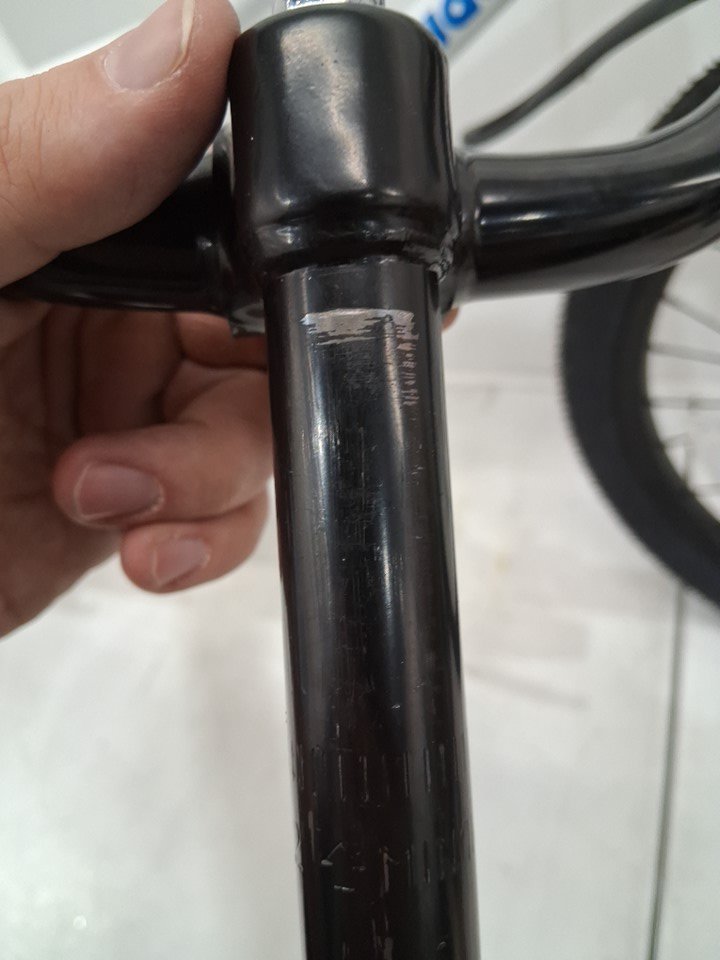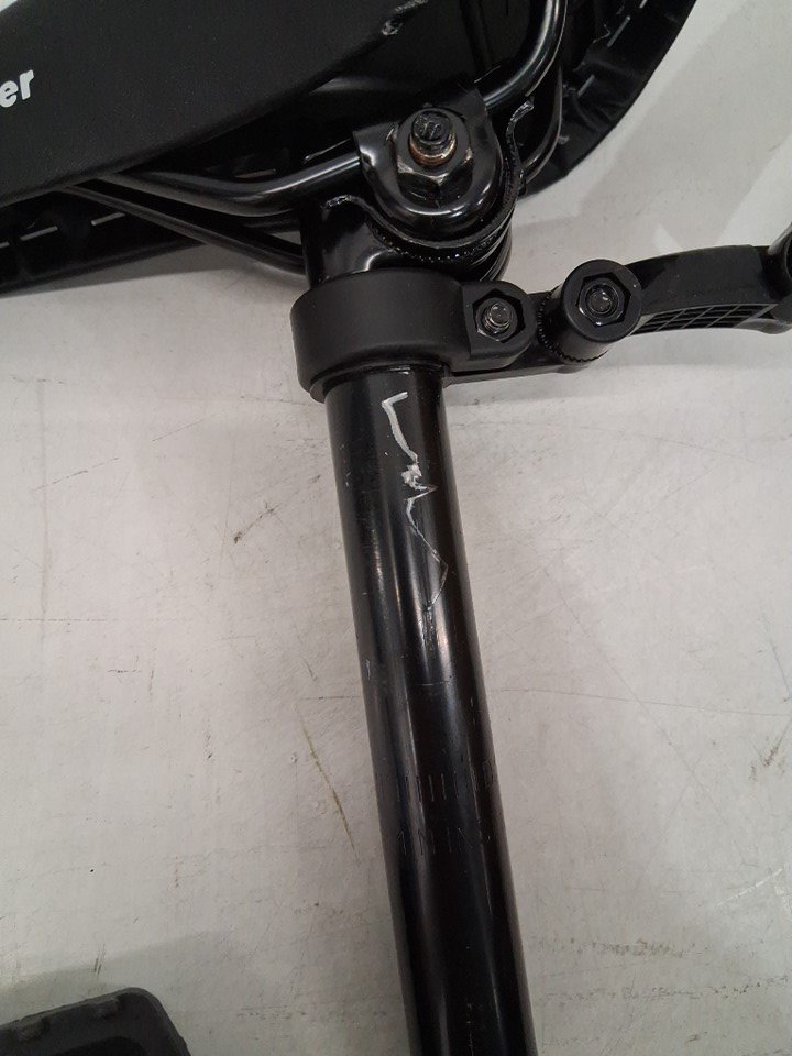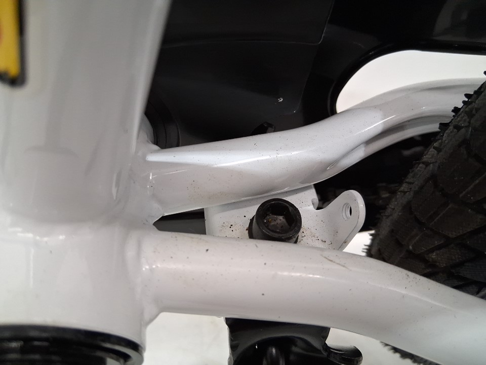 There are scuffs on the metal of the handlebars and seat, as well as dirt on the wheels indicating some previous use. There is also a light scratch in the paint of the bike frame, and the kickstand appears to be attached a bit too tight, currently scraping against the metal housing when opened and closed - see photos. Outside of cosmetic blemishes, there appears to be no significant damage or other issues with the bike.