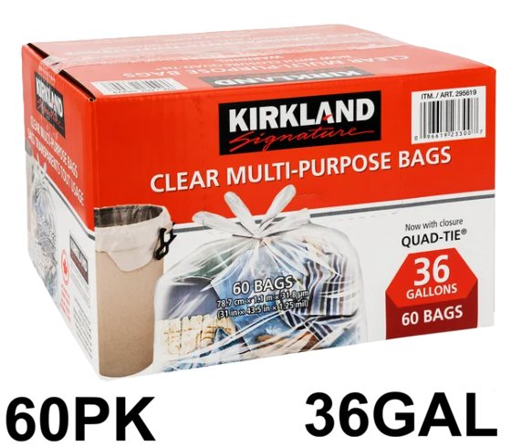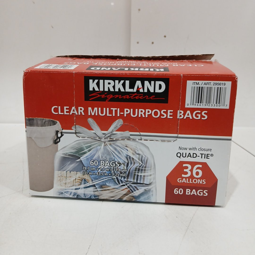 60pk kirkland signature quad tie multi purpose garbage bag - 36 gallon - clear (model: 295619)