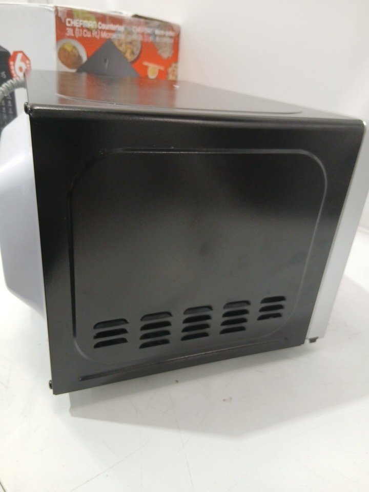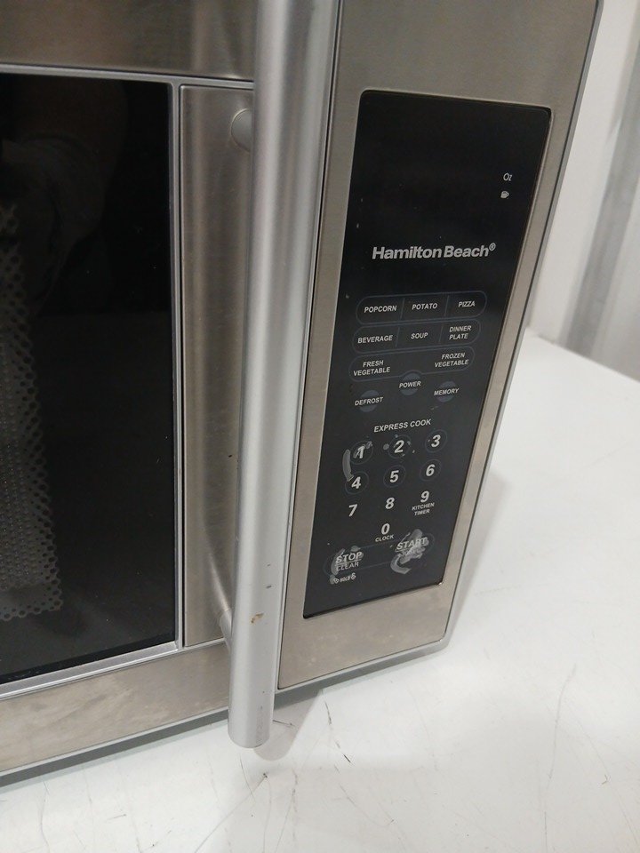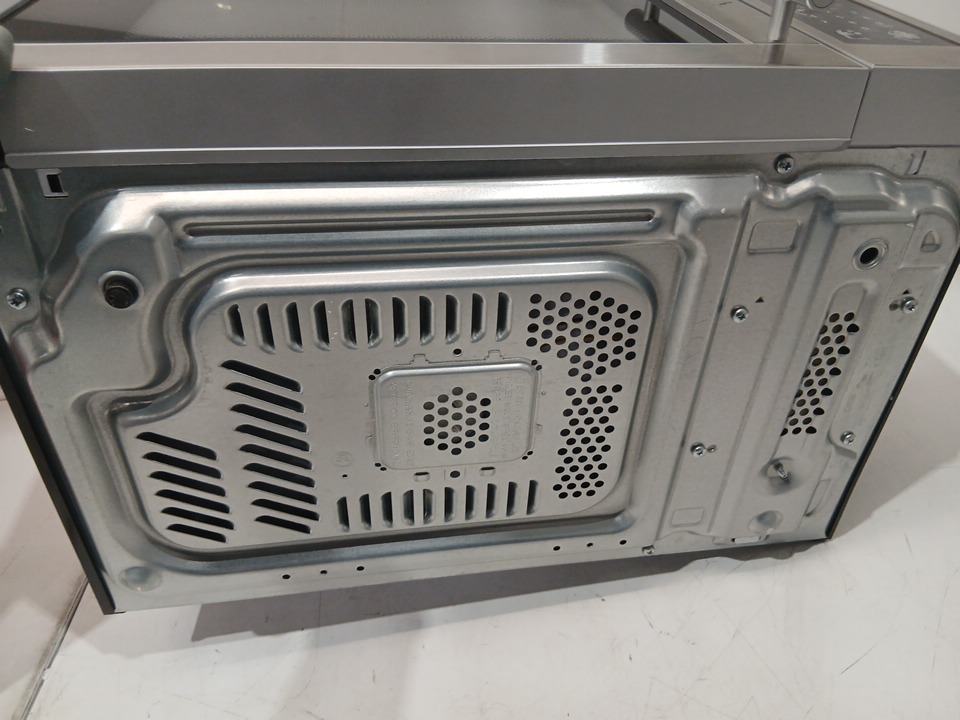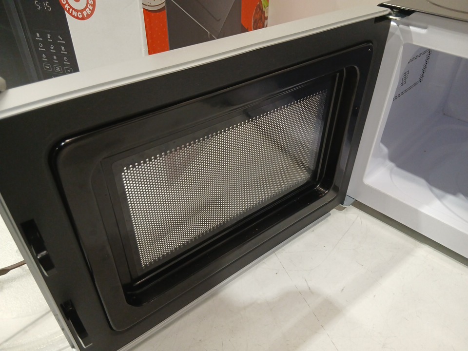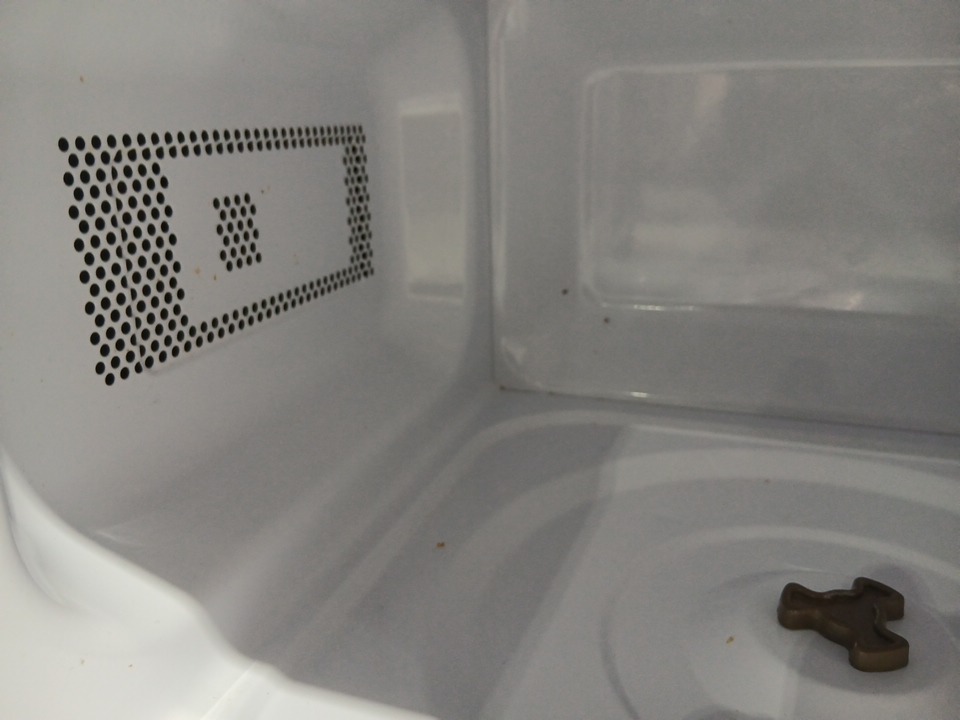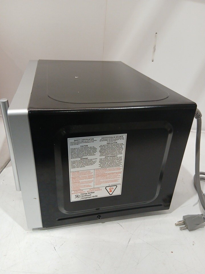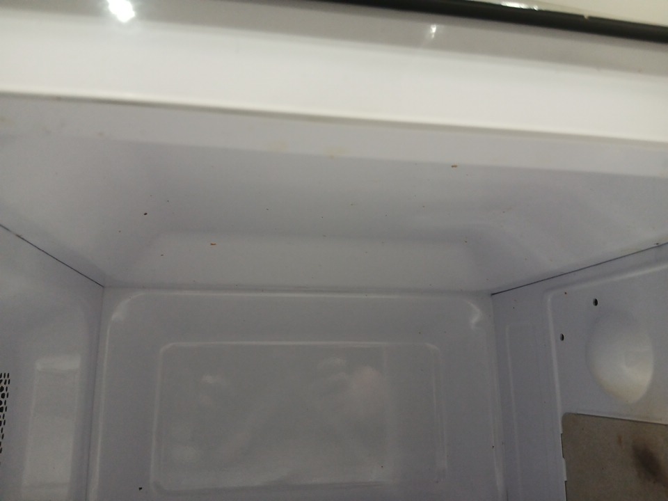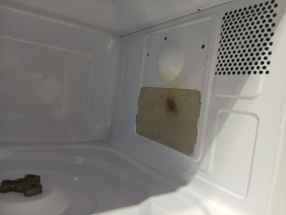 appears lightly used due to food residue inside and on plate, as well as a food smell coming from inside. there is also a small dent present on the back vent, and one of the rubber feet is missing.