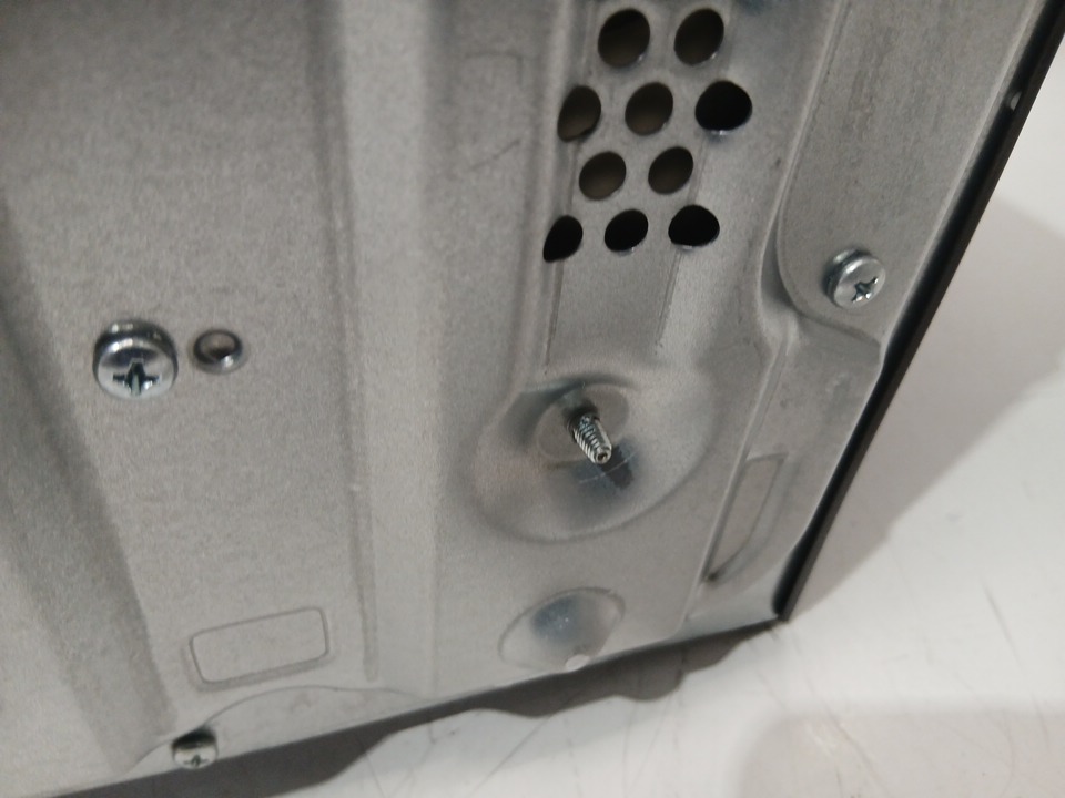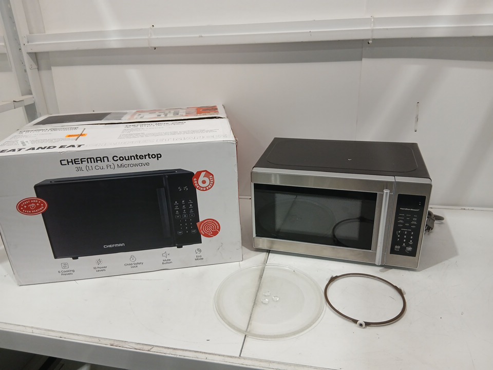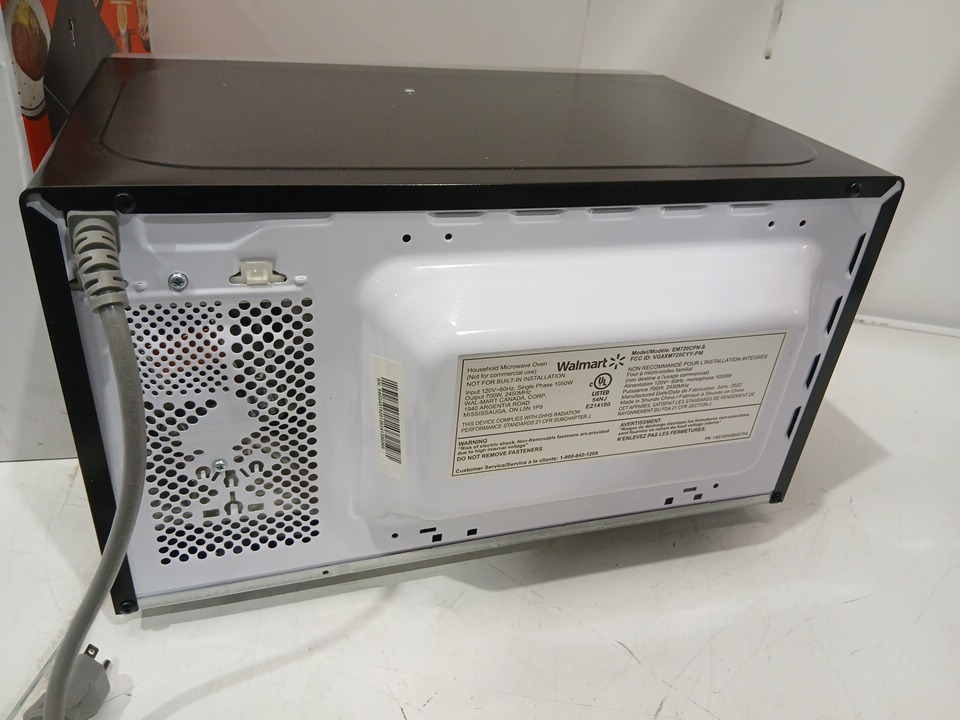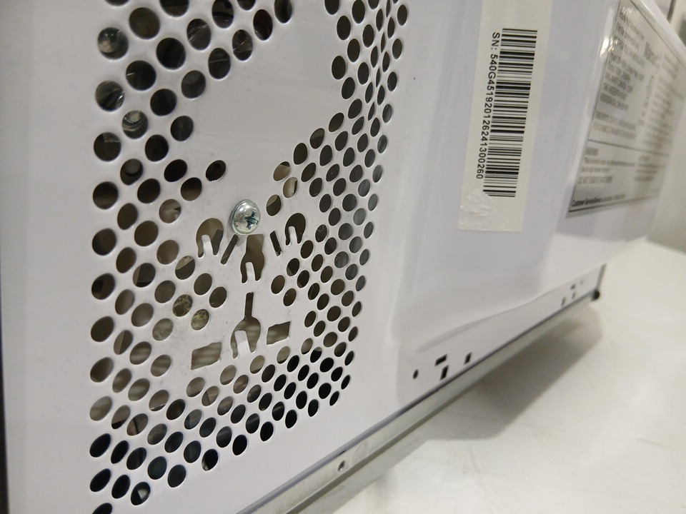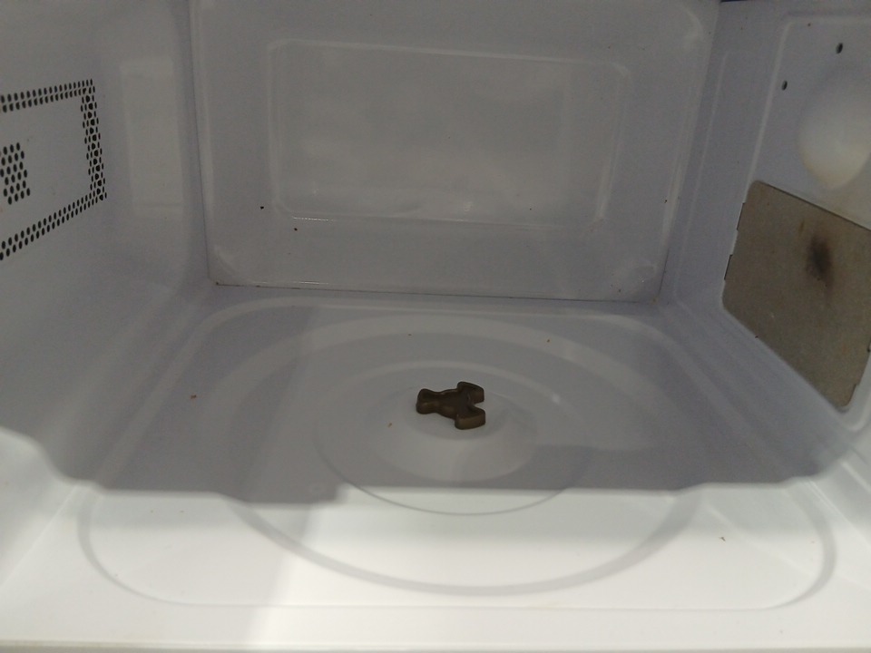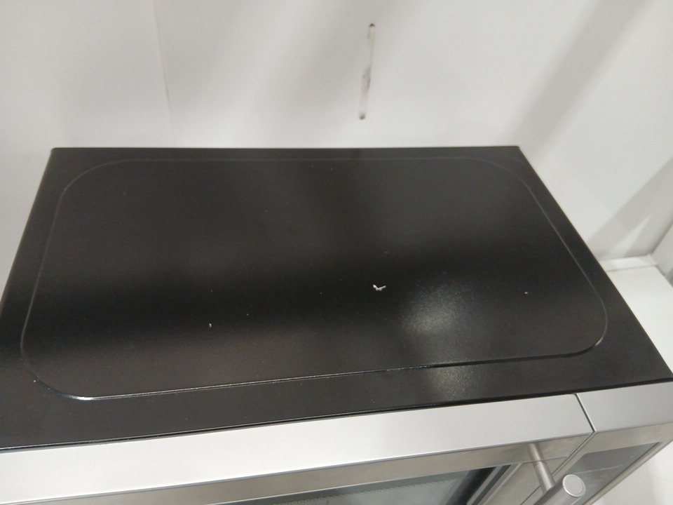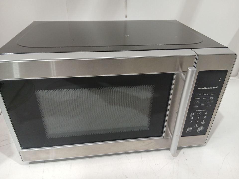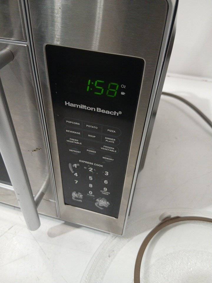 appears lightly used due to food residue inside and on plate, as well as a food smell coming from inside. there is also a small dent present on the back vent, and one of the rubber feet is missing.