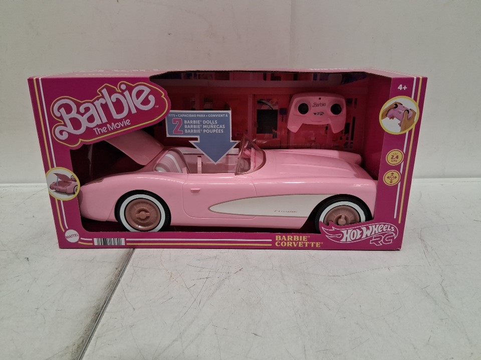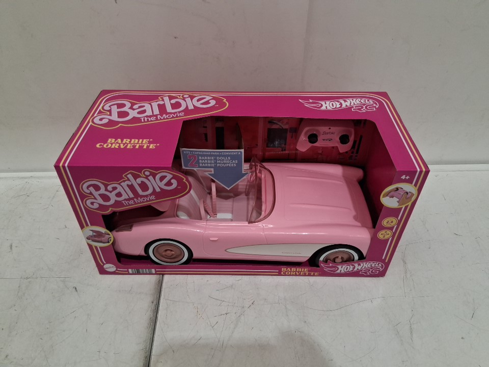BARBIE THE MOVIE BY HOTWHEELS BARBIE CORVETTE RC BATTERY OPERATED TOY CAR, FITS 2 BARBIE DOLLS & TRUNK OPENS FOR STORAGE - PINK (model: HPW40)