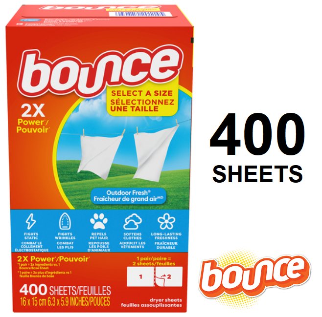 400 SHEETS BOUNCE 2X POWER SELECT A SIZE DRYER SHEETS