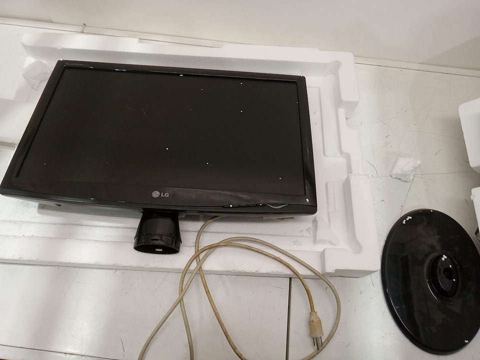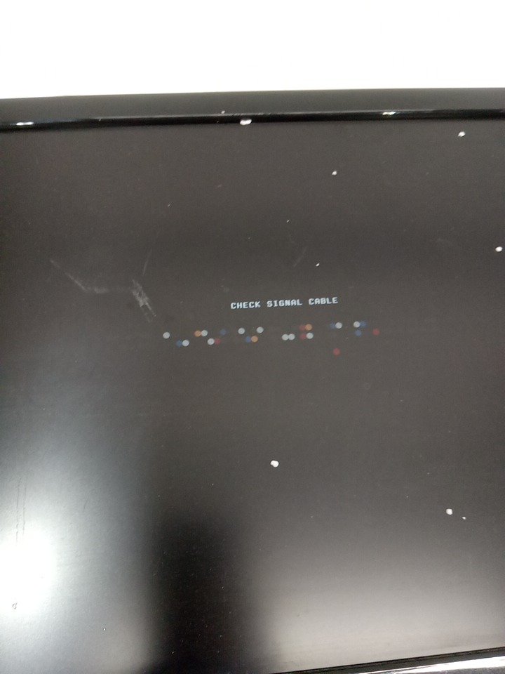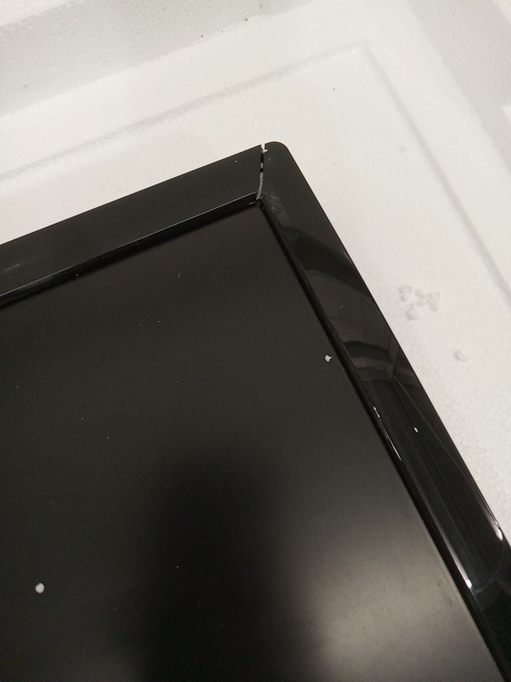 The one corner of the frame is pulled apart. Some marks on the screen that look like they can likely be cleaned. Unable to test fully, tested for power only. 3RD party power cord came with monitor.