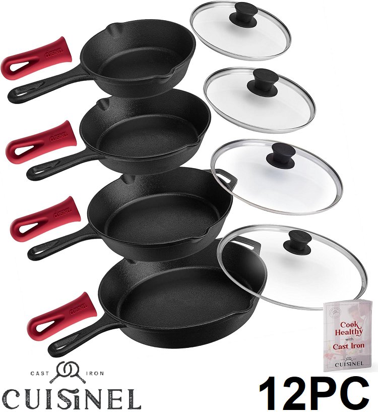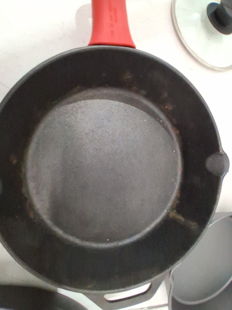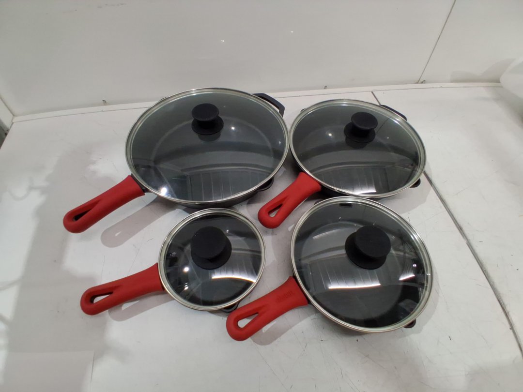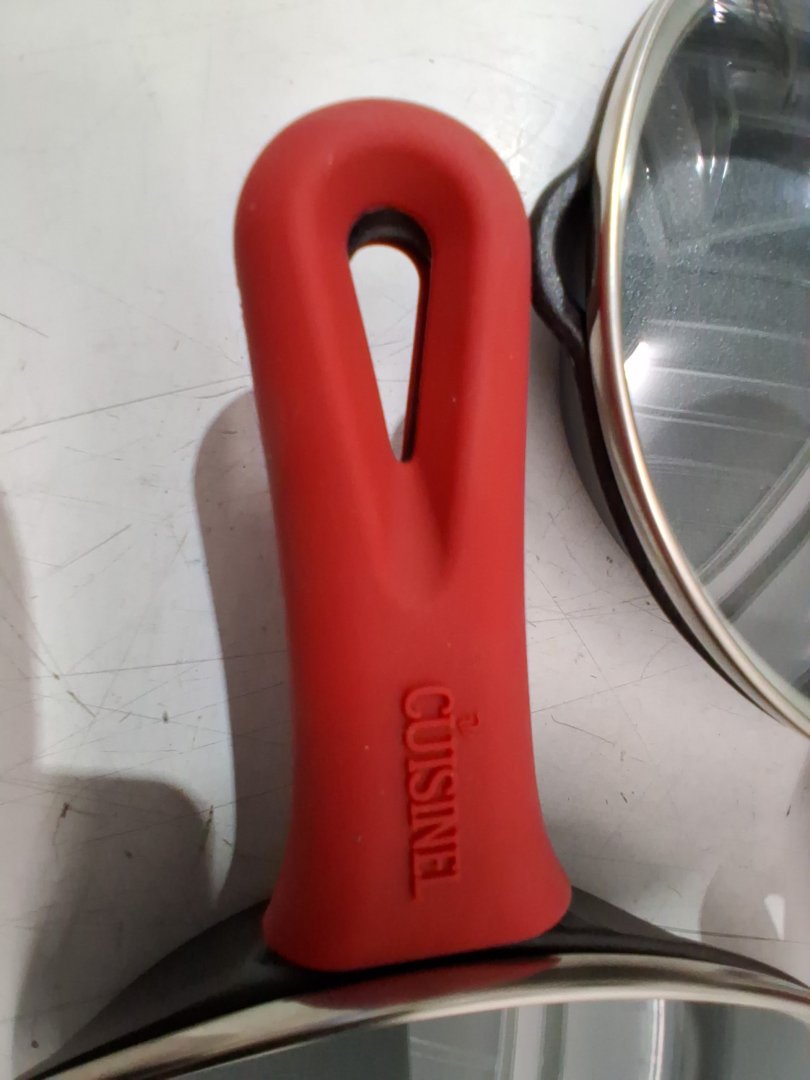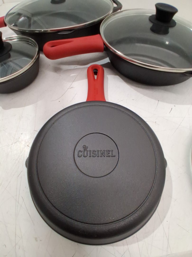 Residue in the 10" pan from previous use and the 12" & 10" lid have small dents in the metal rim, but does not affect fit/function - see photos
