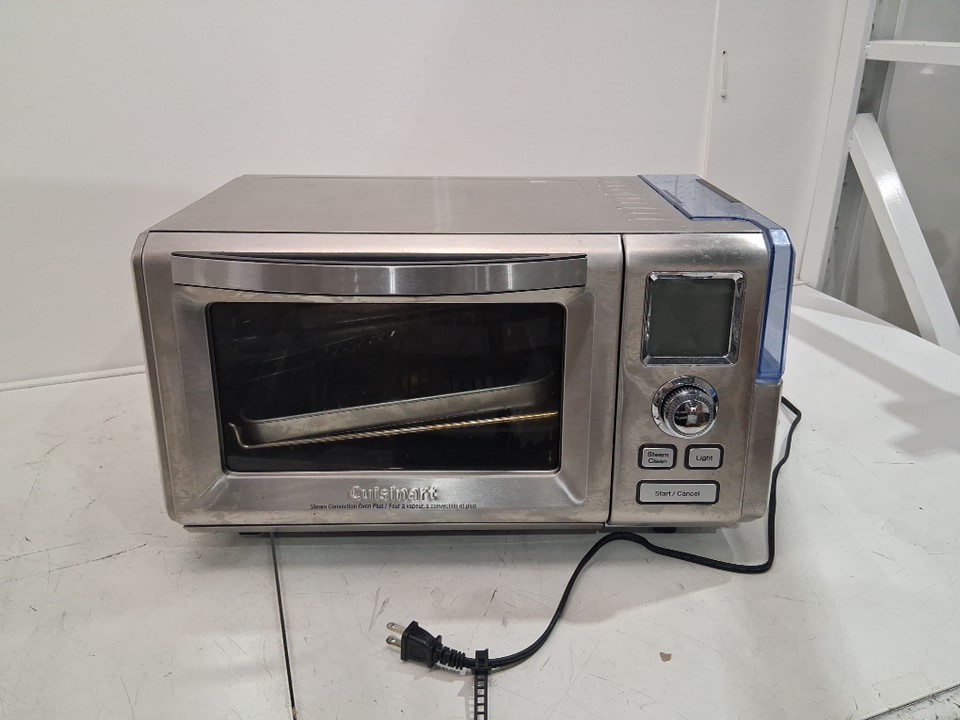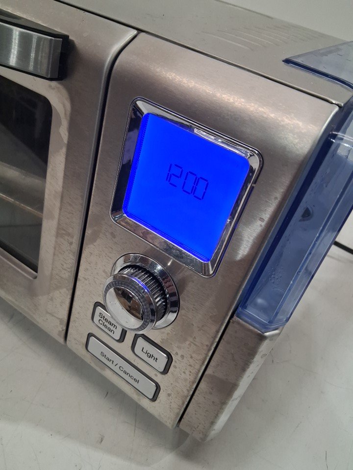 Tested for power. There are some food residue from use inside convection oven, some water marks inside steam compartment and fingerprint marks, see photos.