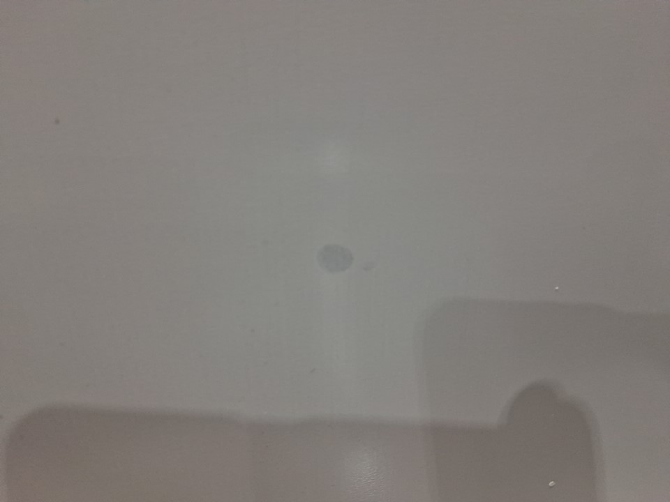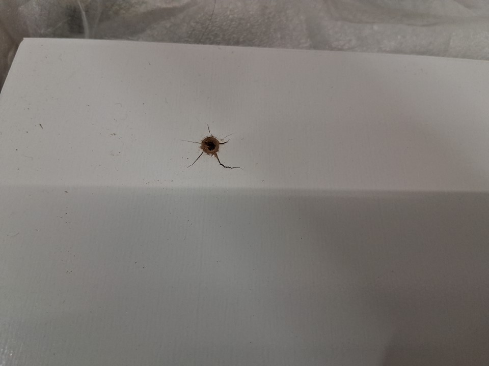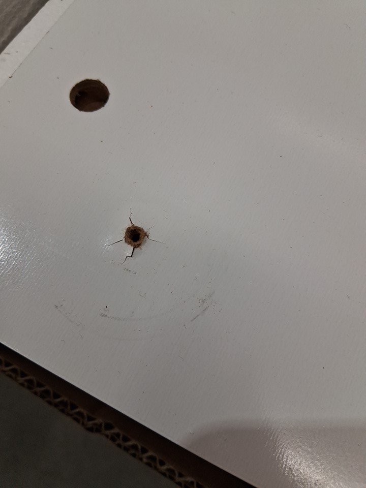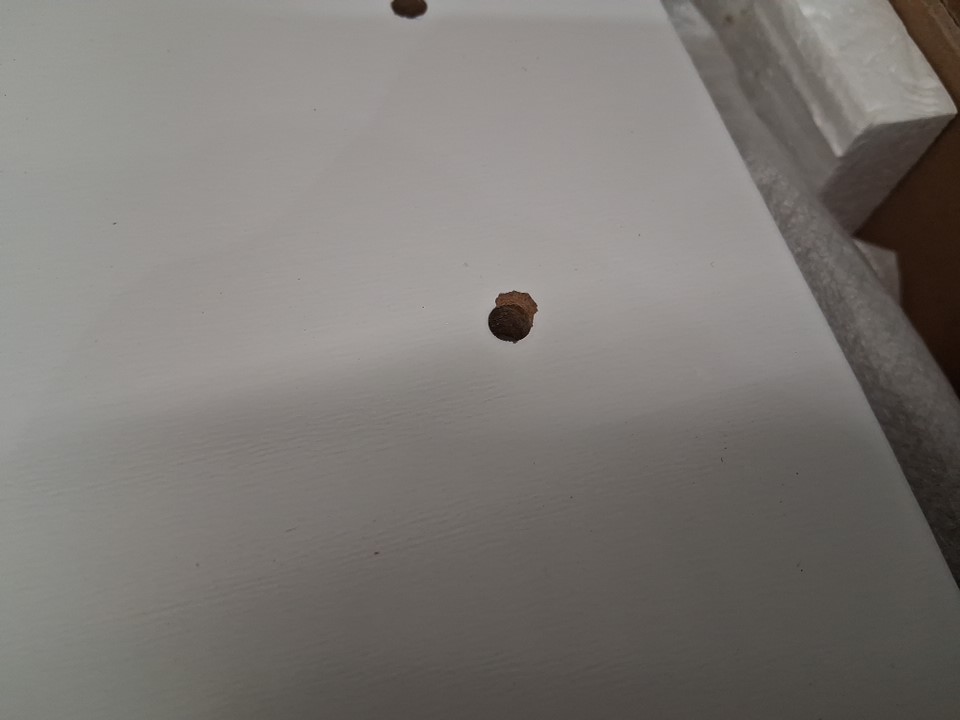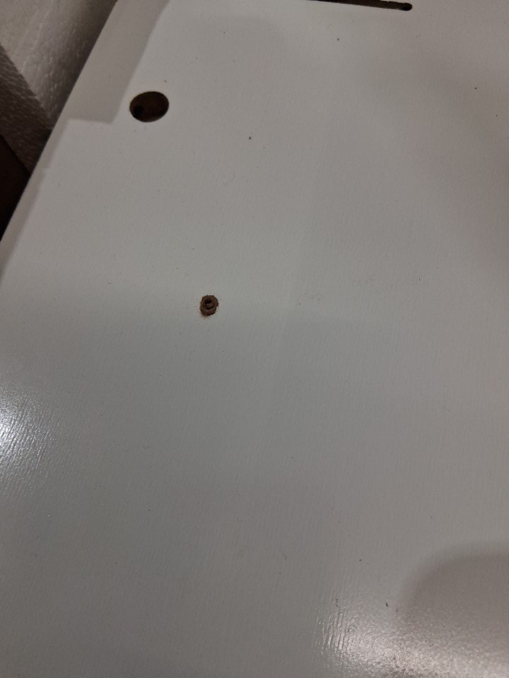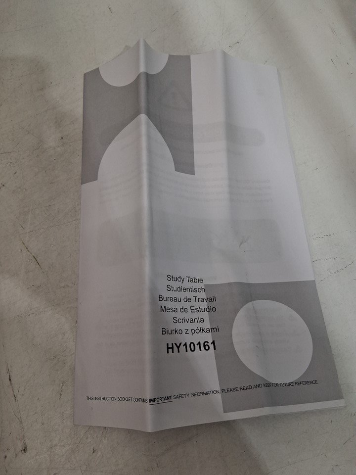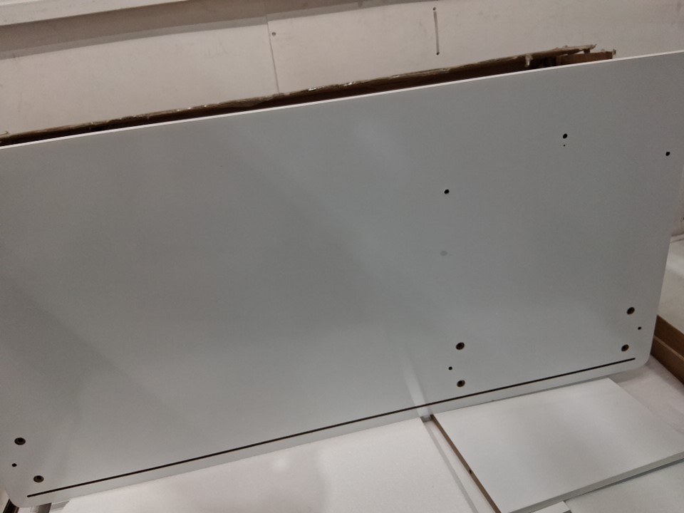 There are many stressed screw holes on a variety of parts, suggesting at least some previous assembly. There is also a small stain on the underside of the desktop, likely due to previous handling or a manufacturing issue - see photos. Outside of these blemishes, there appears to be no major damage or issues with any part, though customer may need to provide some extra hardware (screws, etc) in order to finish assembly, as some may have gone missing during shipping.