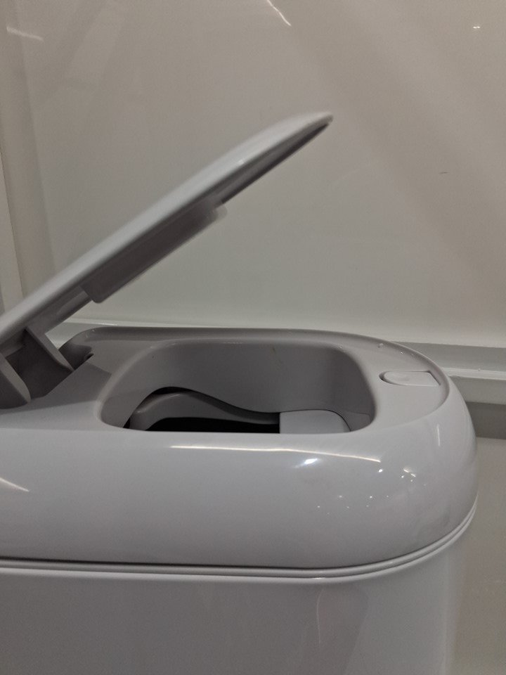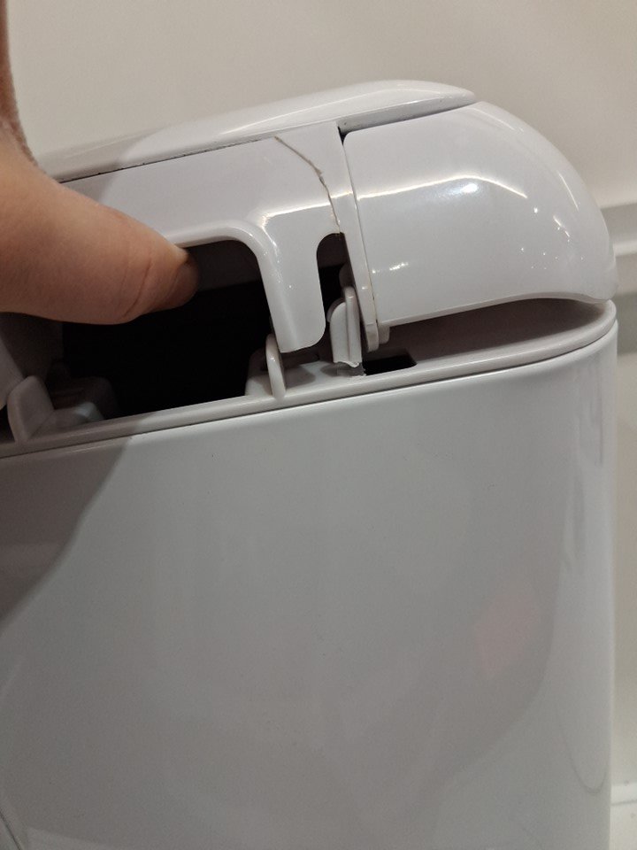 one side on the back has broken. this doesnt affect function. lid still opens and closes, but shouldnt be lifted from this point or will likely break of completly. can has been used and could use a cleaning. no bags included but can be purchased just about anywhere.