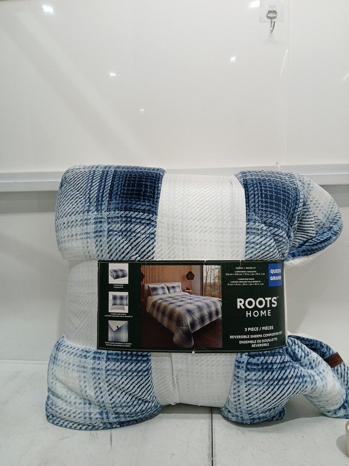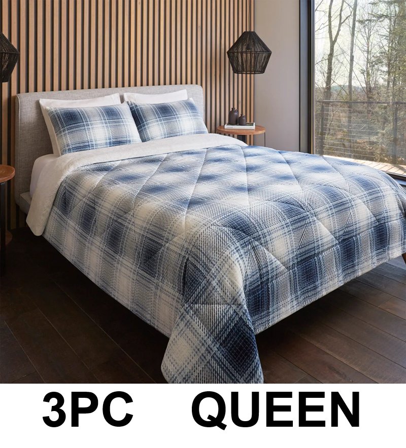 3PC Roots Home Reversible Sherpa Comforter Set - QUEEN - BLUE PLAID