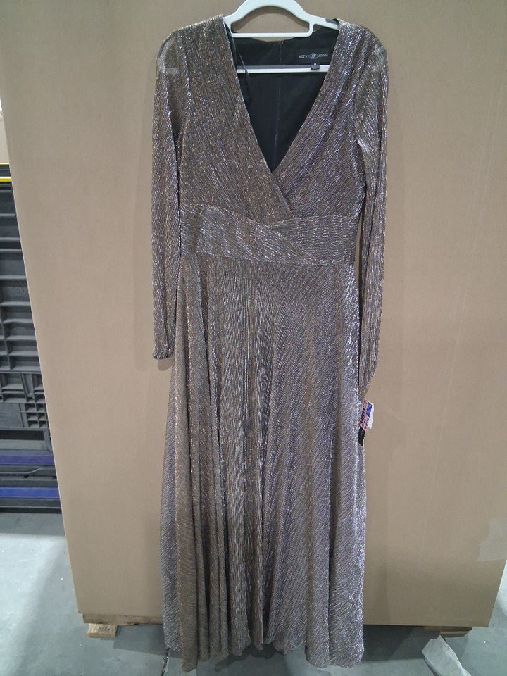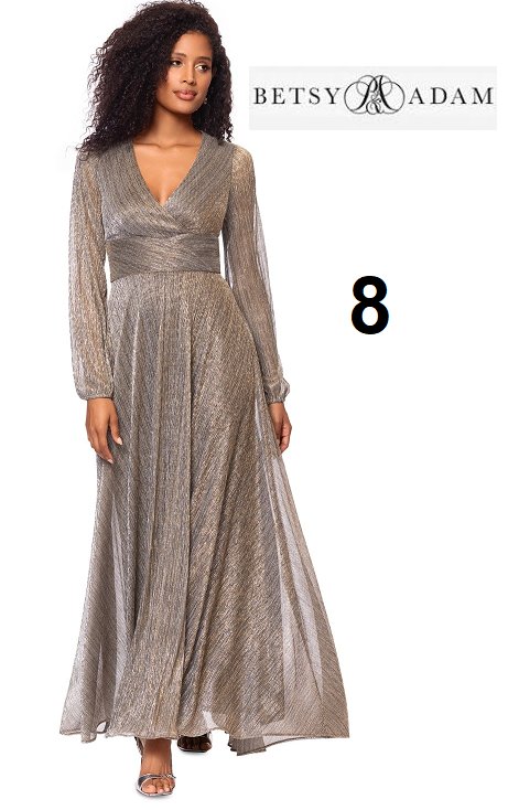 WOMENS BETSY ADAM Long Sleeve, Metallic Crinkle, with Ruched Waist DRESS - SIZE 8 - GOLD/ MOCHA (STYLE: A25358R)