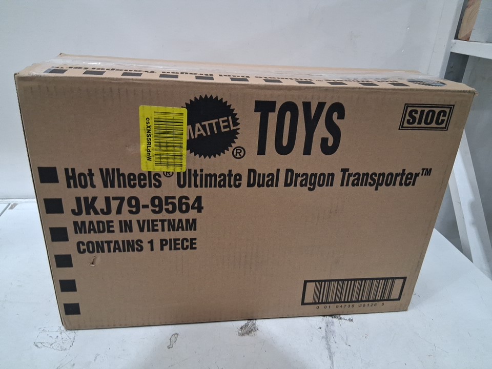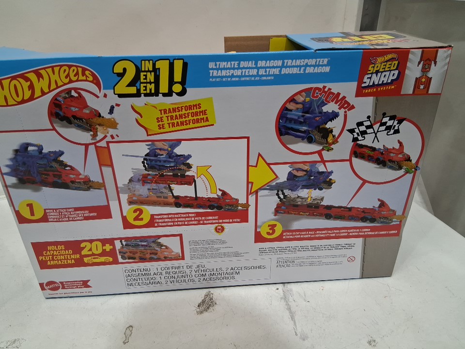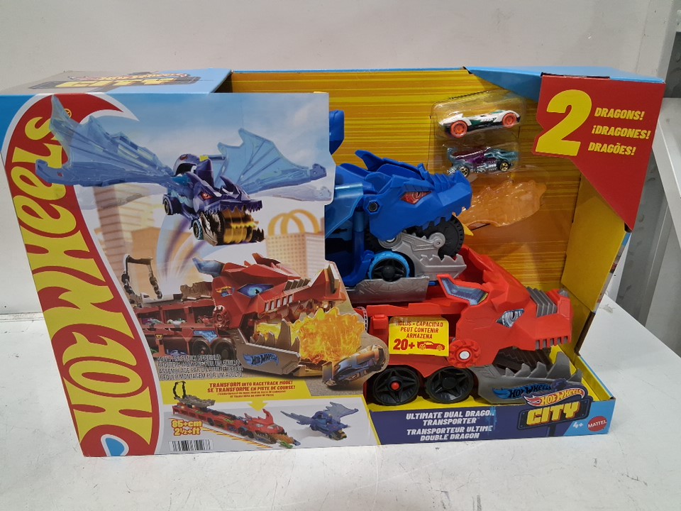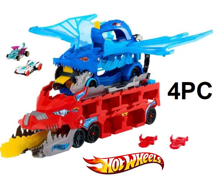 4pc Hot Wheels City Toy Car Track Set Ultimate Dual Dragon Transporter with 2 Die-Cast Cars - fits 20 cars - (model: jkj79-9564)