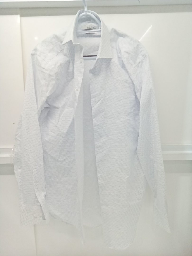 men's calvin klein slim fit long sleeve patterned dress shirt - large (34/35) - white/blue (style: 4279451)