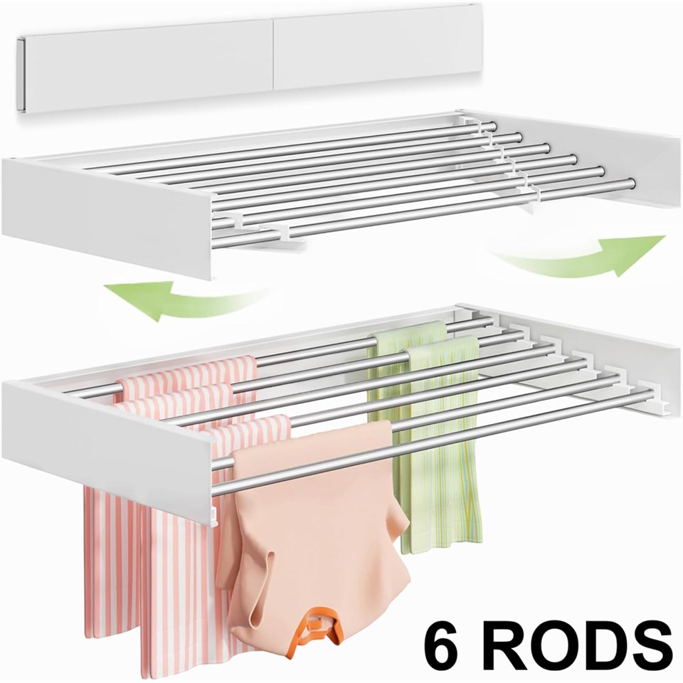 Wall Mounted Foldable Clothes Drying Rack - 6 rods - white