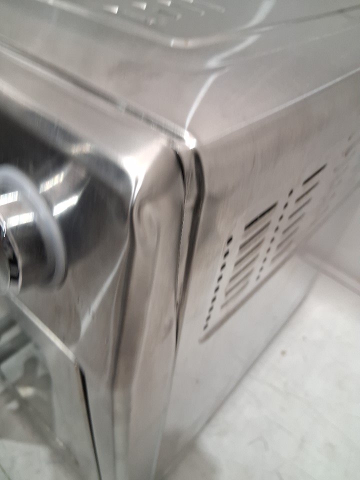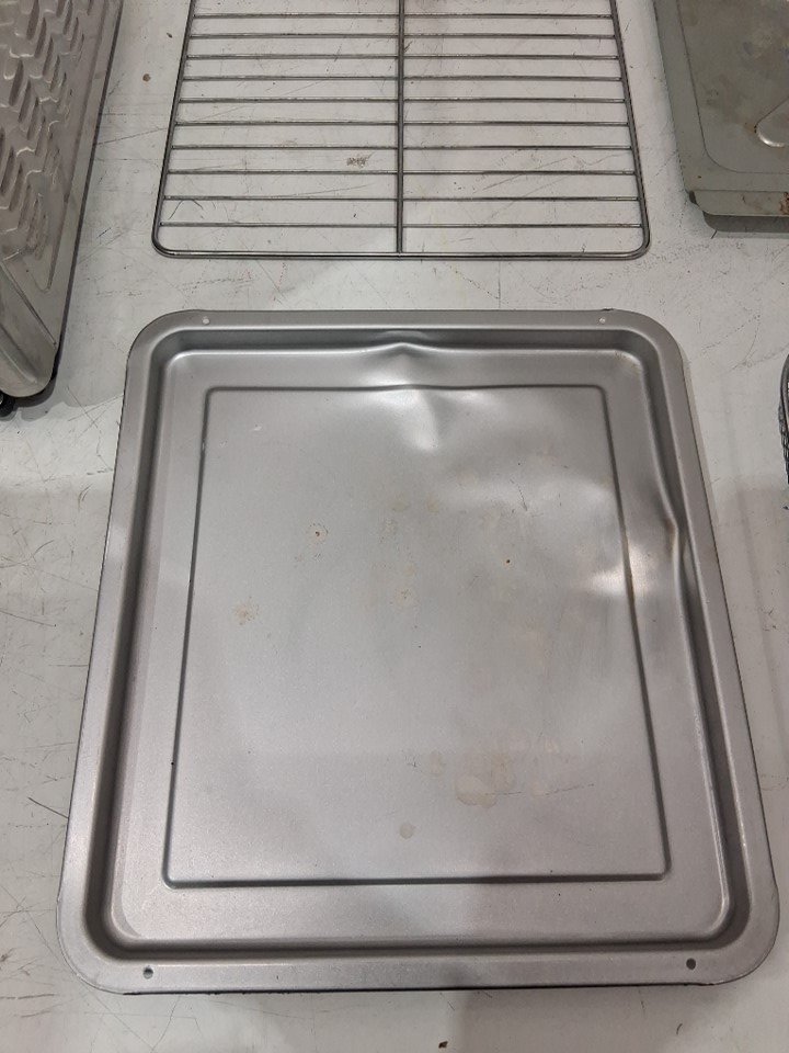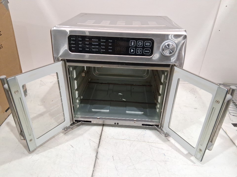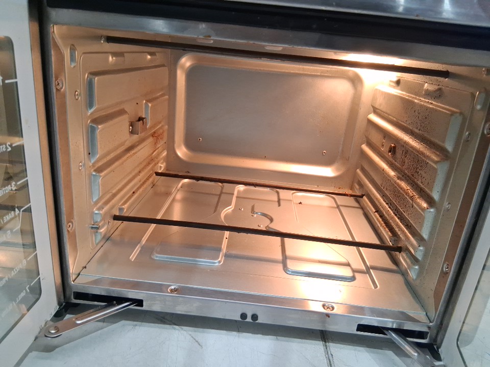 Please note that the rotisserie spit, fetch tool, grill plate and grill plate handle are missing from the original packaging. There are food stains and dents on the tray/pan, there is a dent on the top right corner due to previous use. There are scratch marks around the product. Tested for power and heat only. (Please see photos)