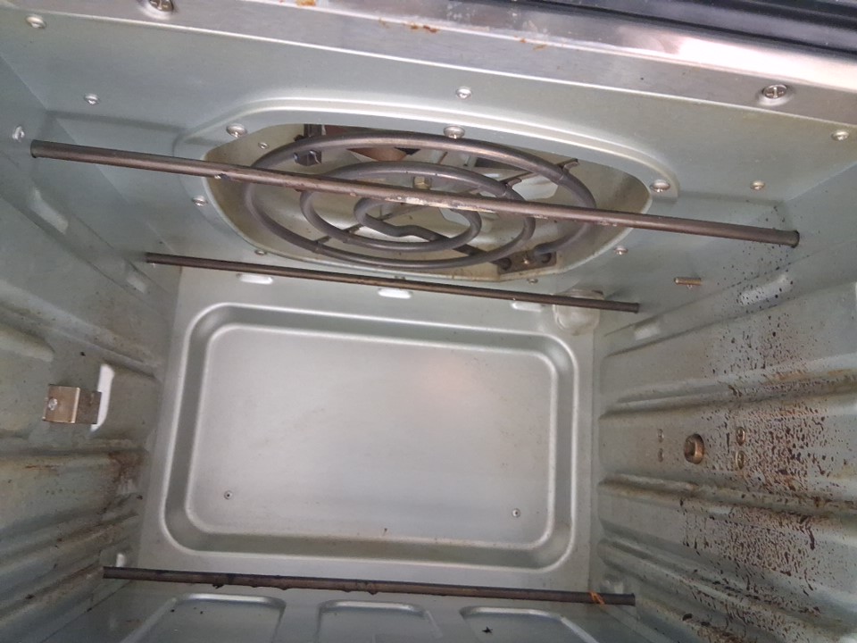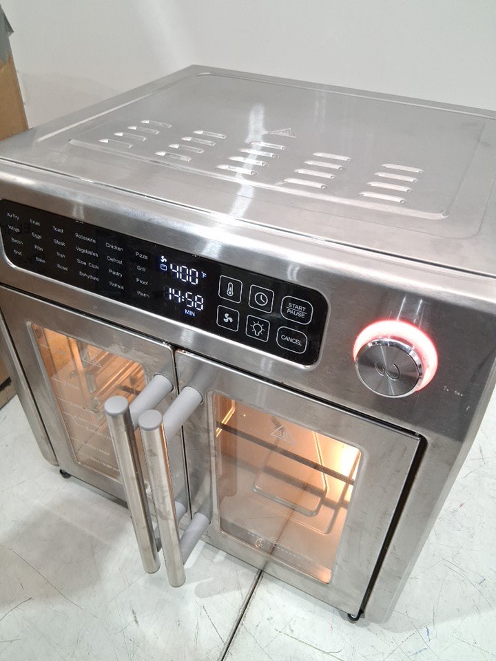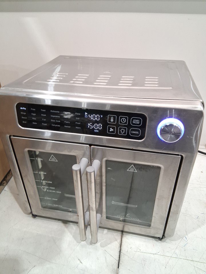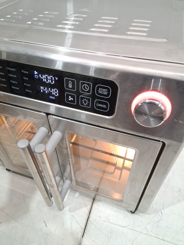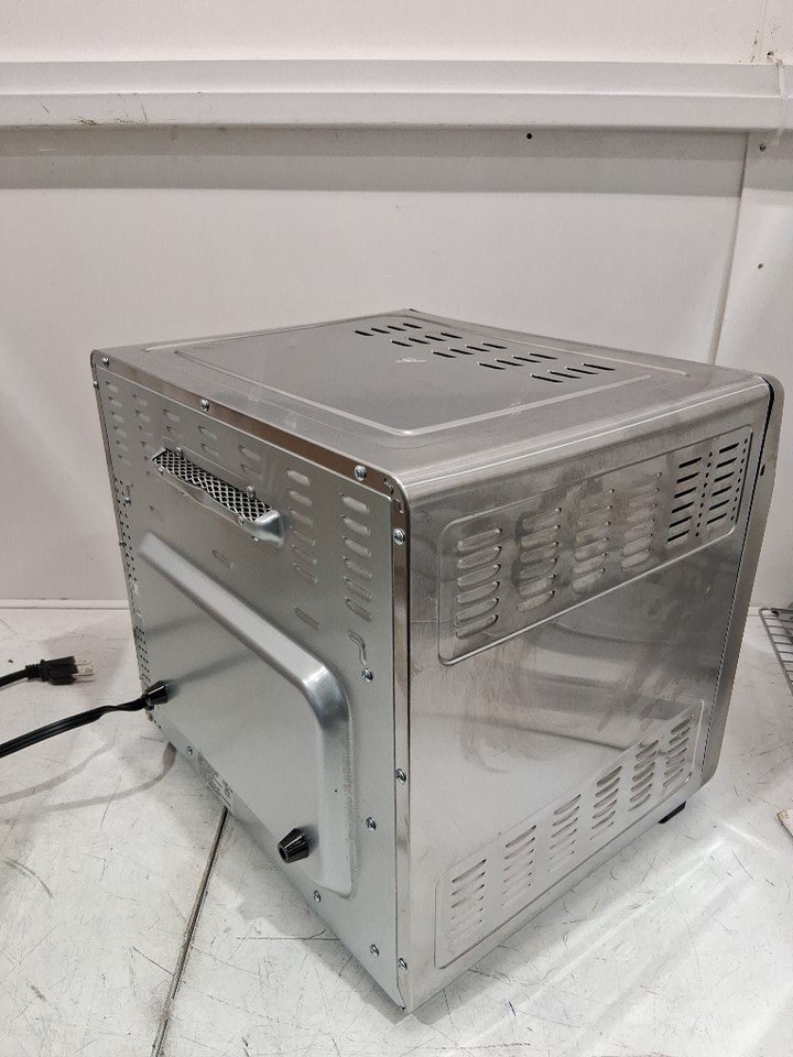 Please note that the rotisserie spit, fetch tool, grill plate and grill plate handle are missing from the original packaging. There are food stains and dents on the tray/pan, there is a dent on the top right corner due to previous use. There are scratch marks around the product. Tested for power and heat only. (Please see photos)