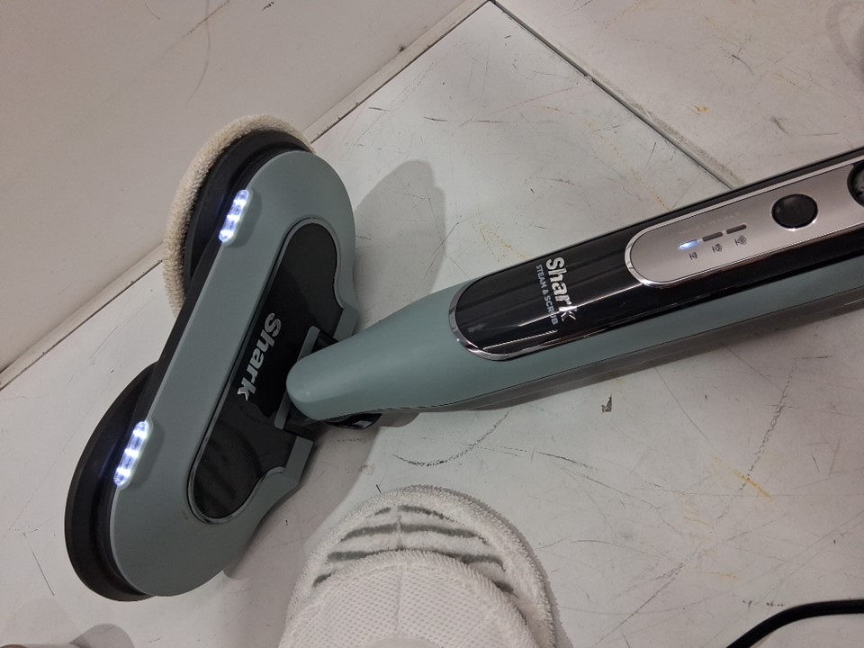This item arrived without the retail box and has signs use. Two of the scrub pads have been used and there is residual water in the tank. There is also small nicks and scratches on the body of the item. See photos. Tested for power.