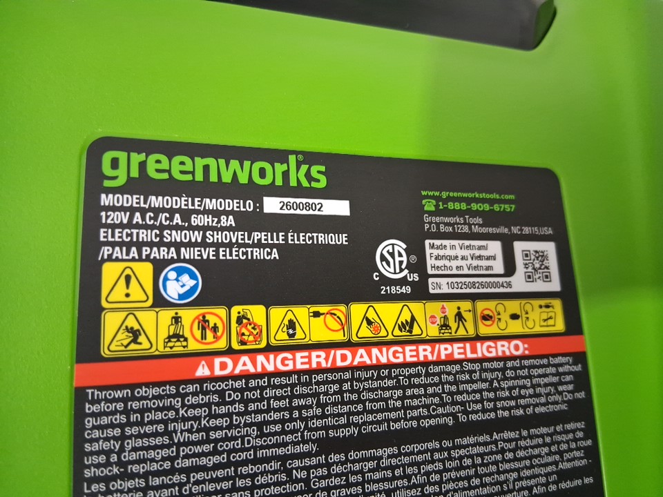 GREENWORKS PRO 12" 8A CORDED ELECTRIC SNOW SHOVEL - GREEN (MODEL: 2600802)