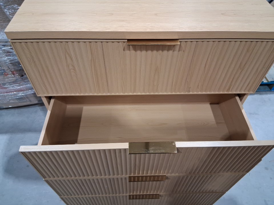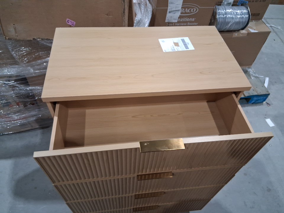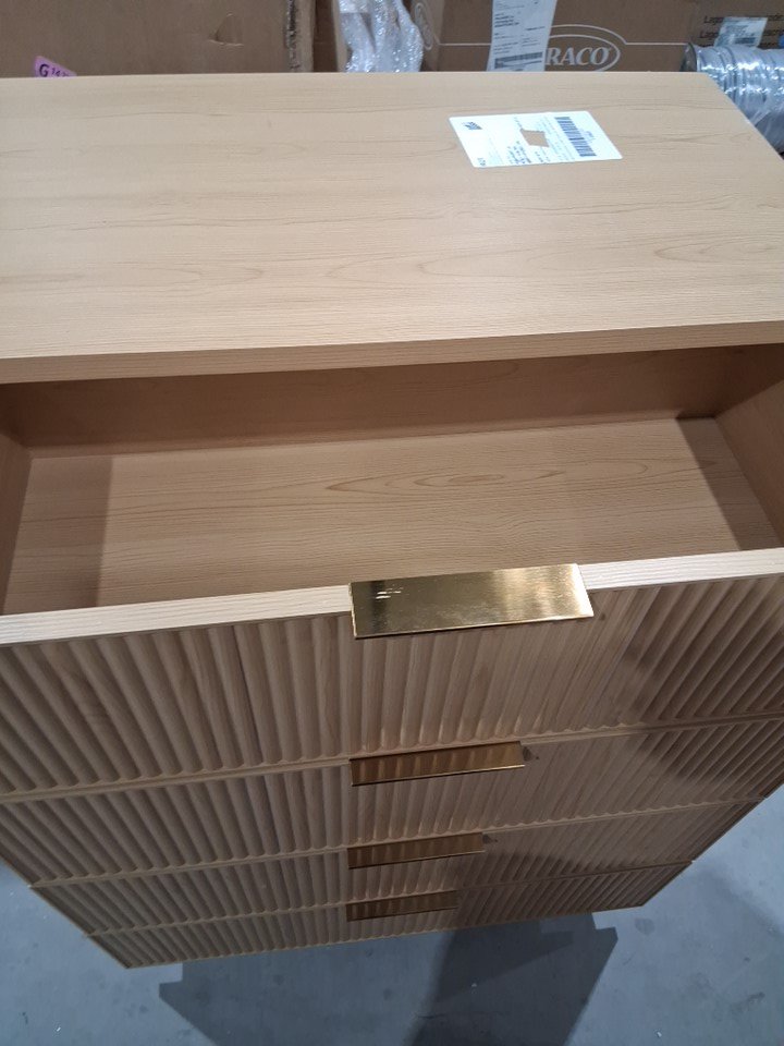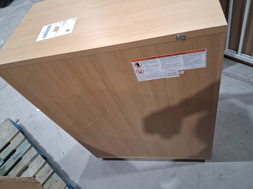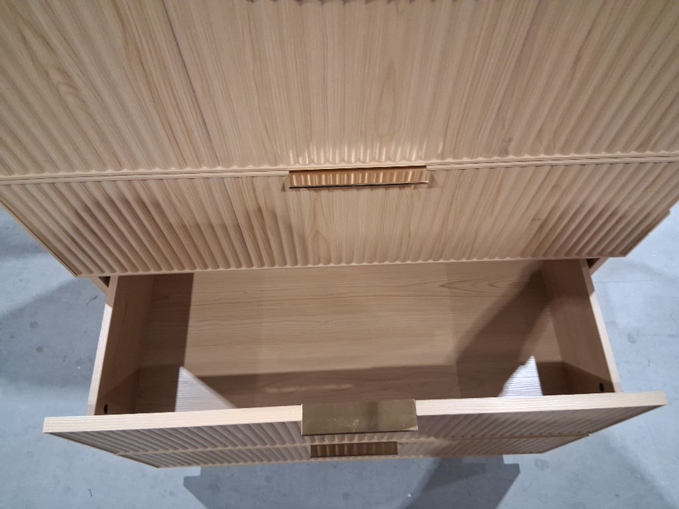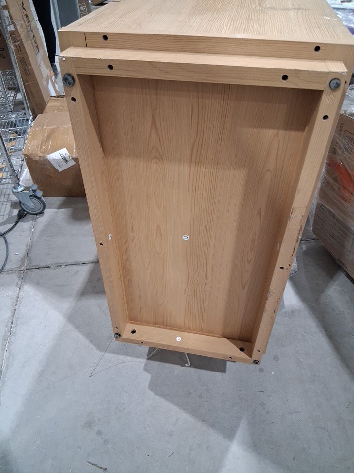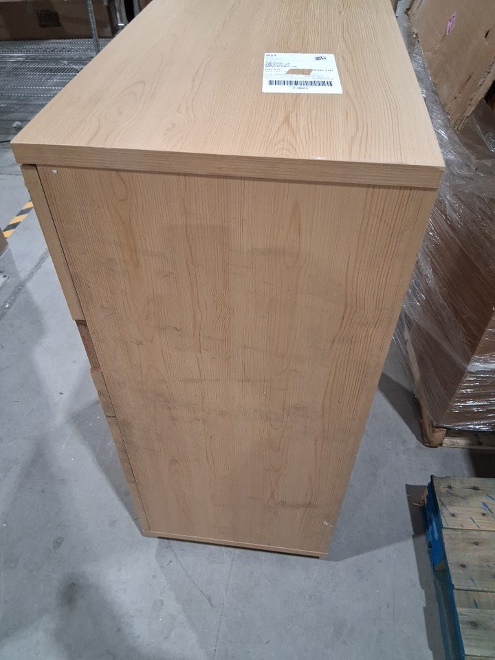 One of the drawer panels has major chipping on the side and back has a large but shallow scratch Main image is the right item but for some reason photos used appear a little yellow