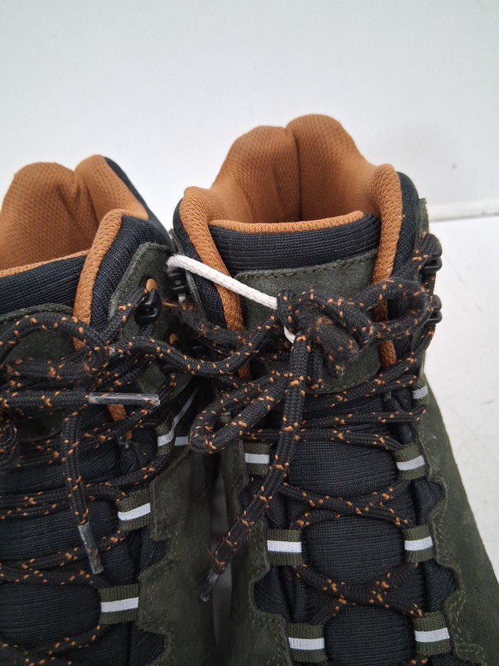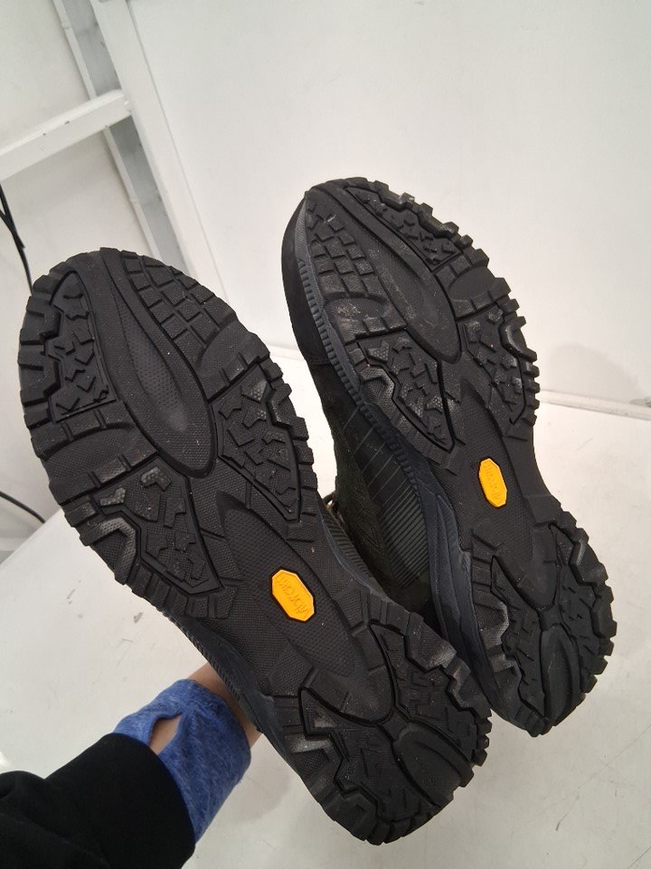 item has some dust on bottom, some light marks, and one of the laces is slightly damaged from previous use please refer to pictures