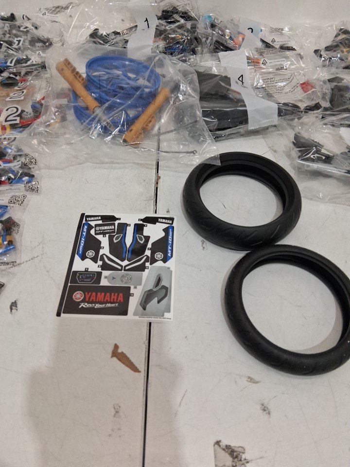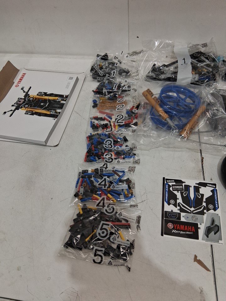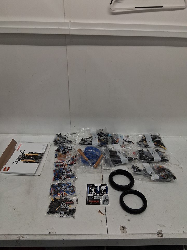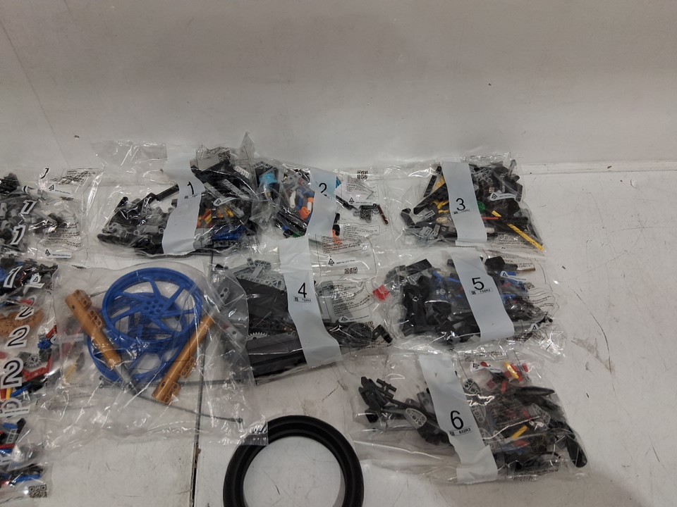 12 numbered bags (1-6) + 1 unnumbered + 2 loose tires are present. All the bags are sealed.