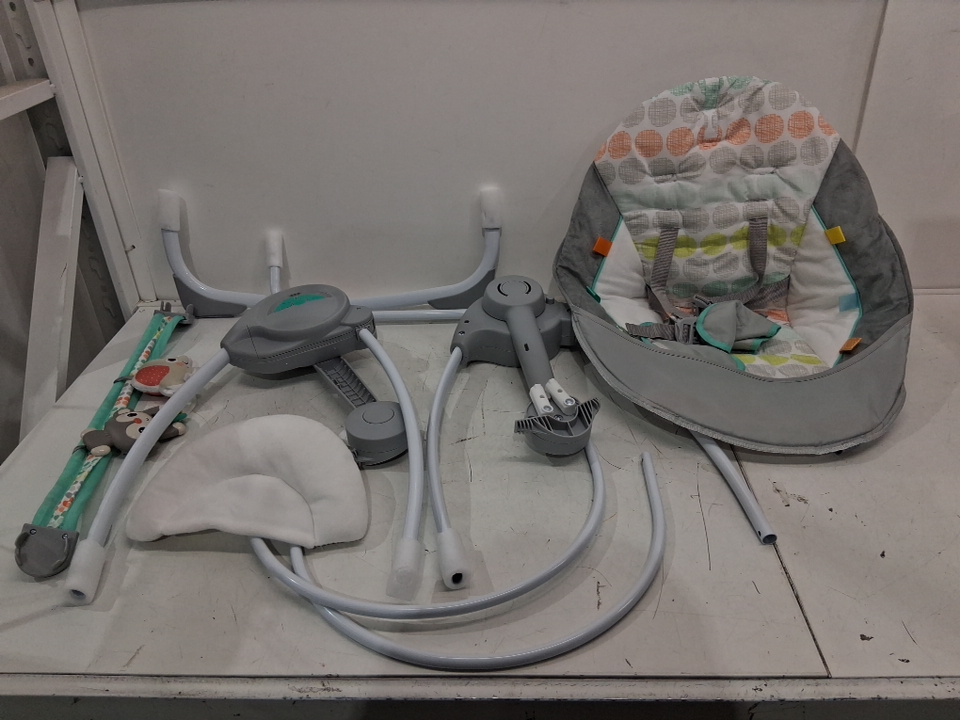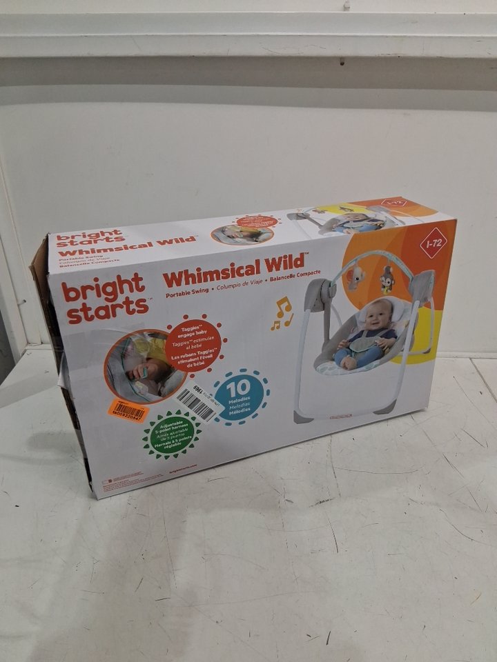 BRIGHT STARTS WHIMSICAL WILD PORTABLE COMPACT AUTOMATIC SWING WITH 10 MELODIES AND ADJUSTABLE HARNESS - MAX 20LBS - WHITE SAFARI ANIMALS (MODEL: 11803-mees)