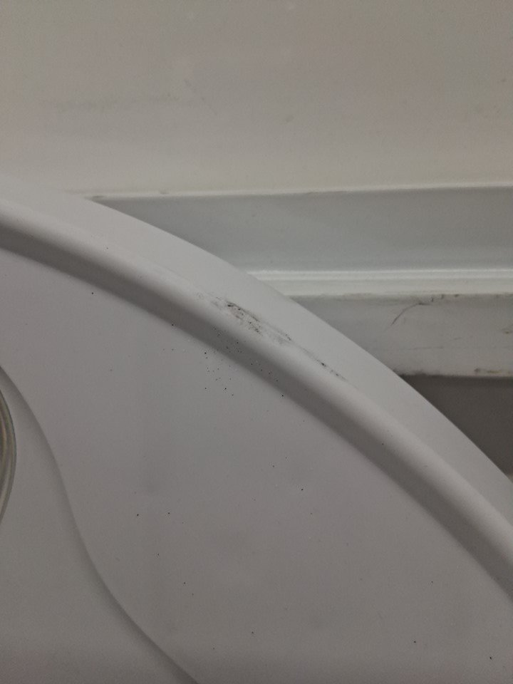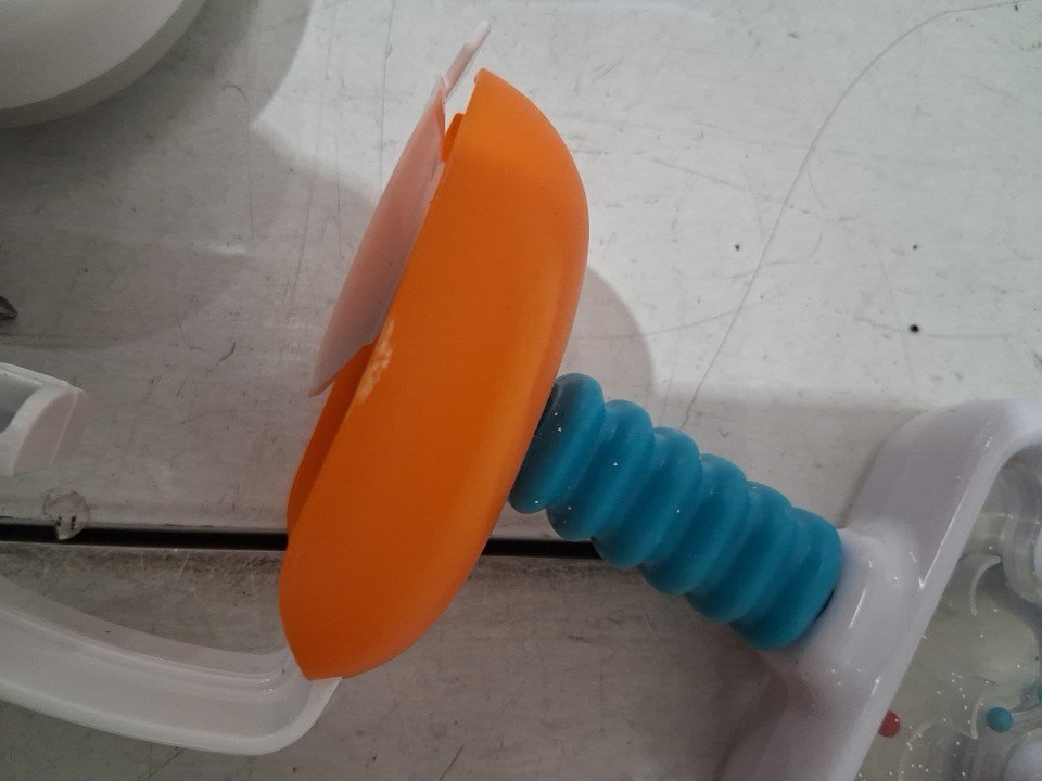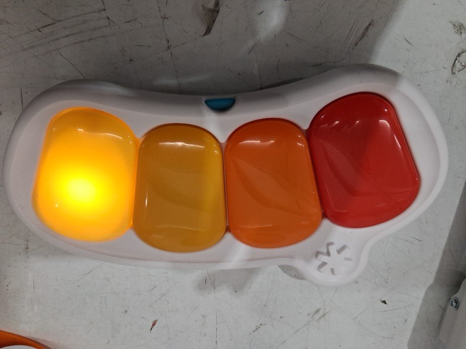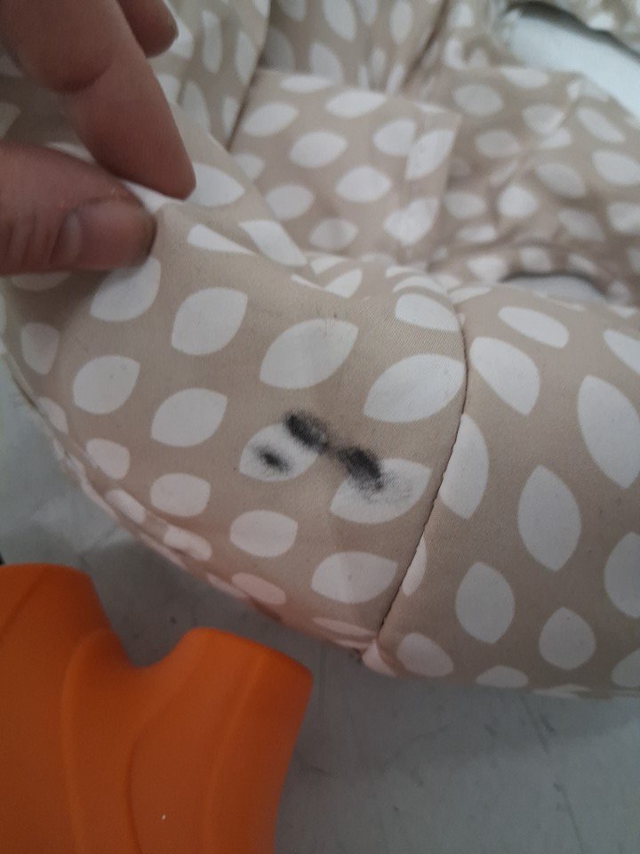 item is missing bee bowl and has some scuffs and marks on some attachments and table , also fabric baby seat cover has some ink on it ( see photos )