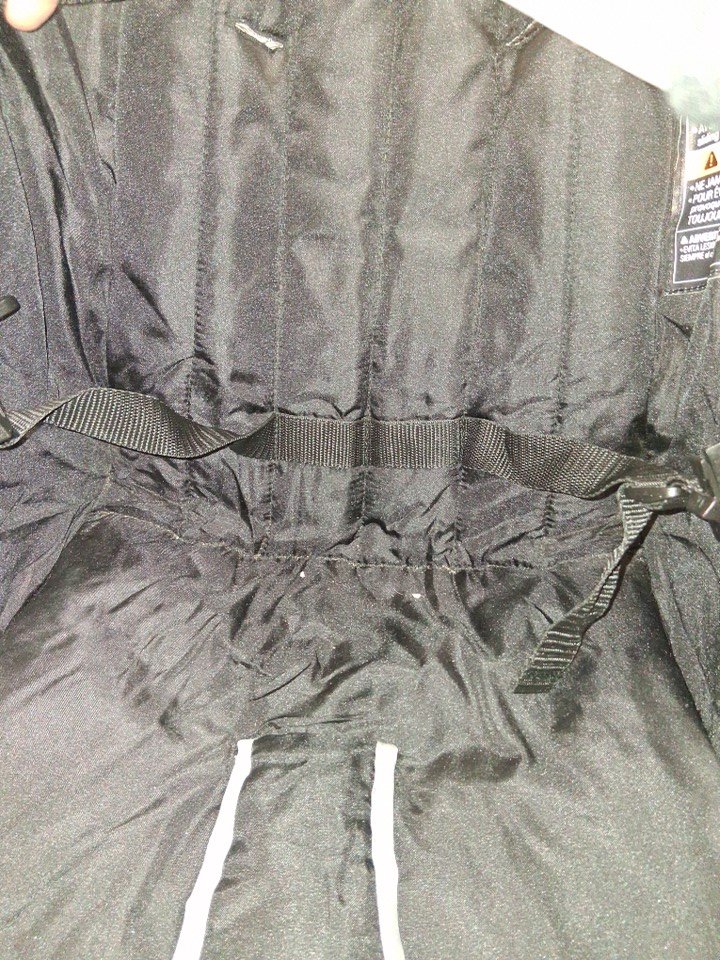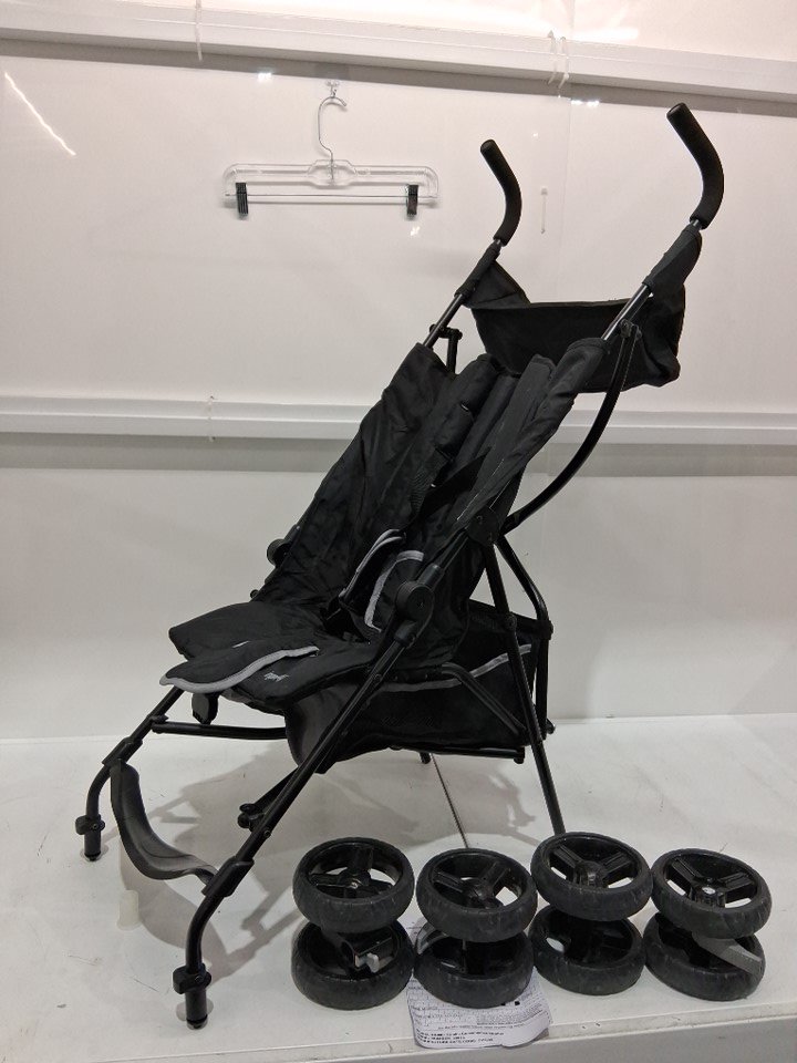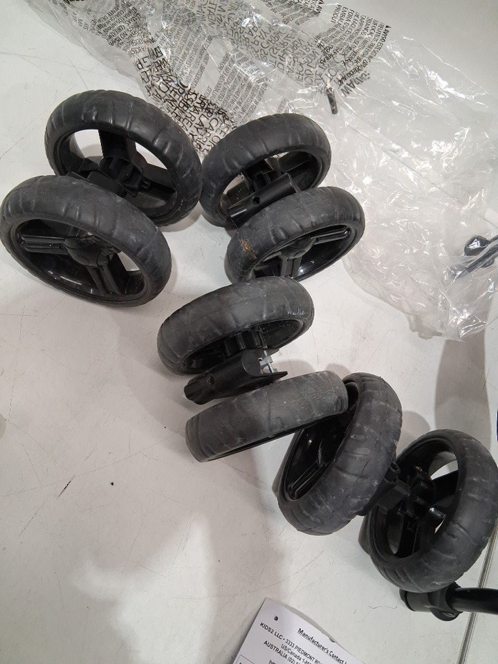 Crumbs on the seat and debris on the wheels indicate previous use. See image details.