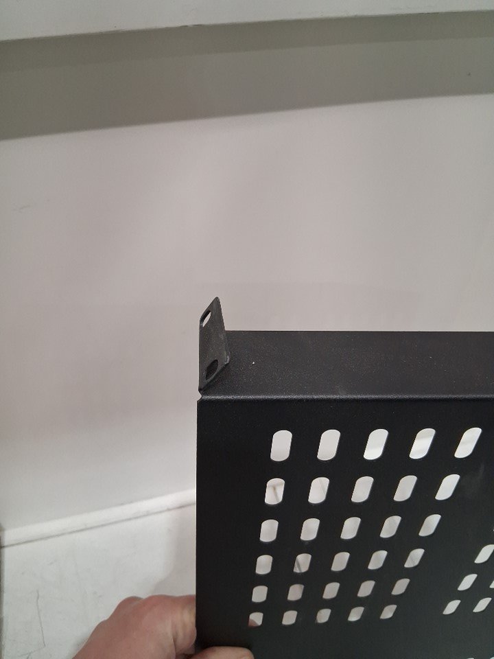 Mounting tabs are bent, should be able to bend back. Missing the mounting screws
