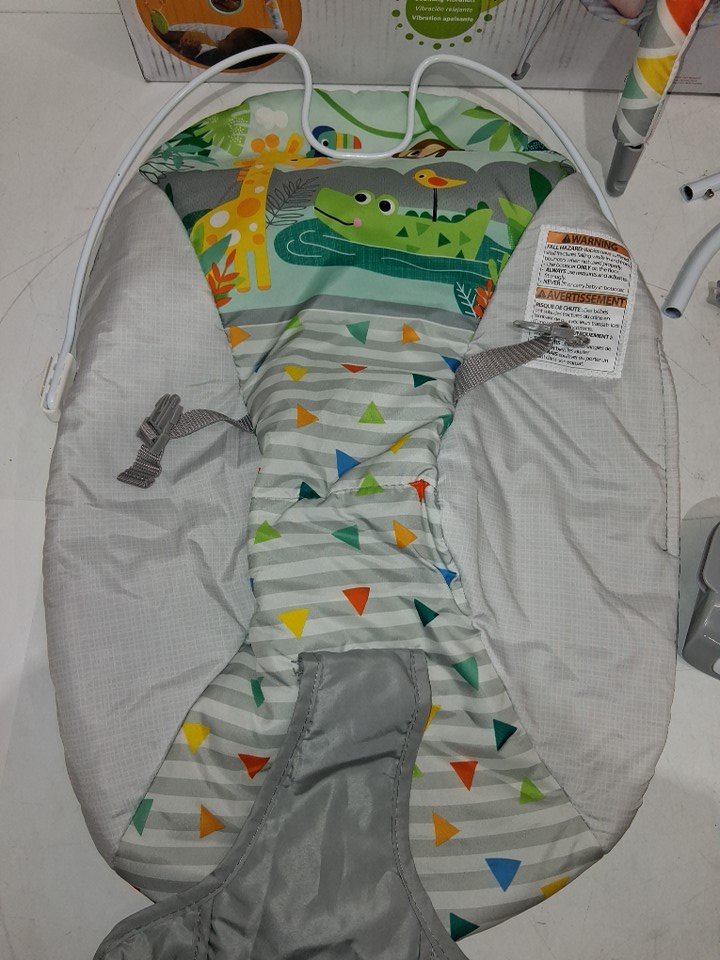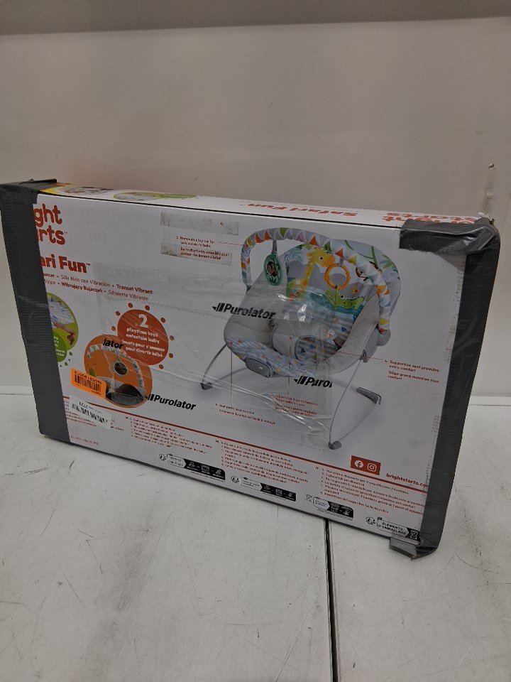 bright starts vibrating bouncer with 3-point harness and removable toy bar - 20lb max - safari fun (model: 12204)