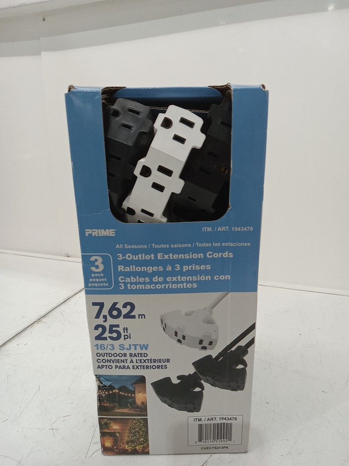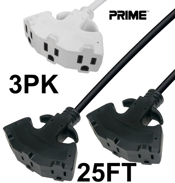 3PK PRIME 3 OUTLET Outdoor Extension Cord - 25FT - BLACK/WHITE (MODEL:CUECY6213PK)