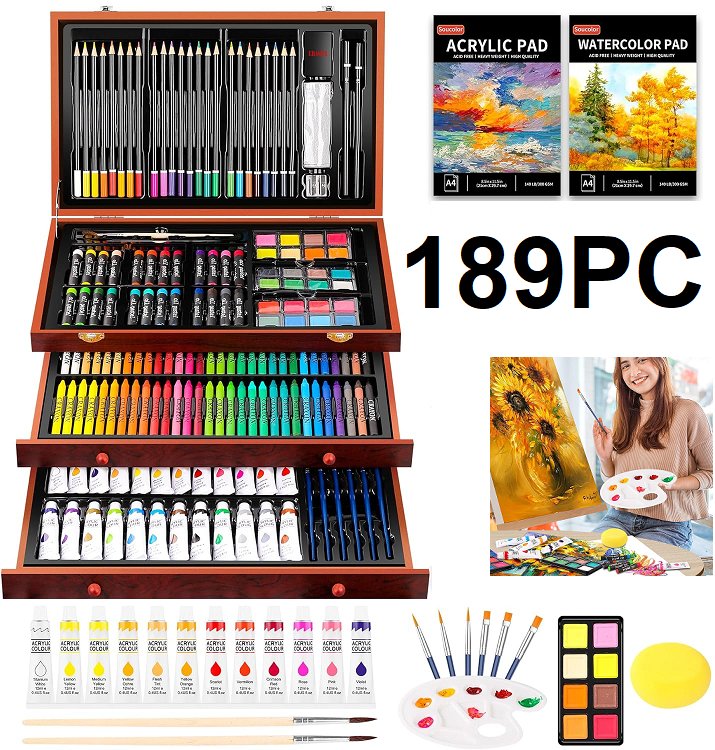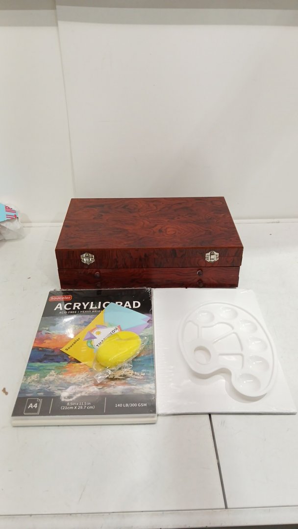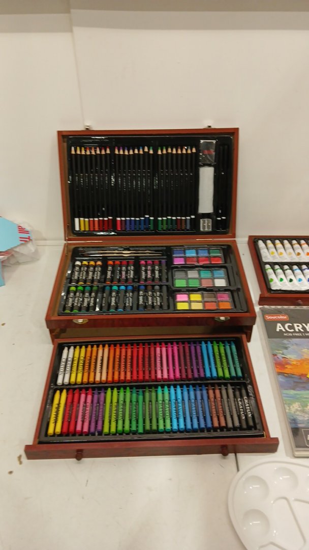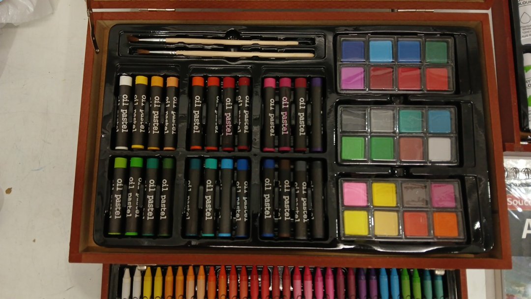 item appears to be new however it is missing some of the paint brushes, unable to confirm if we are missing the sketch books that is supposed to come with it due to the books being sealed together- see photos