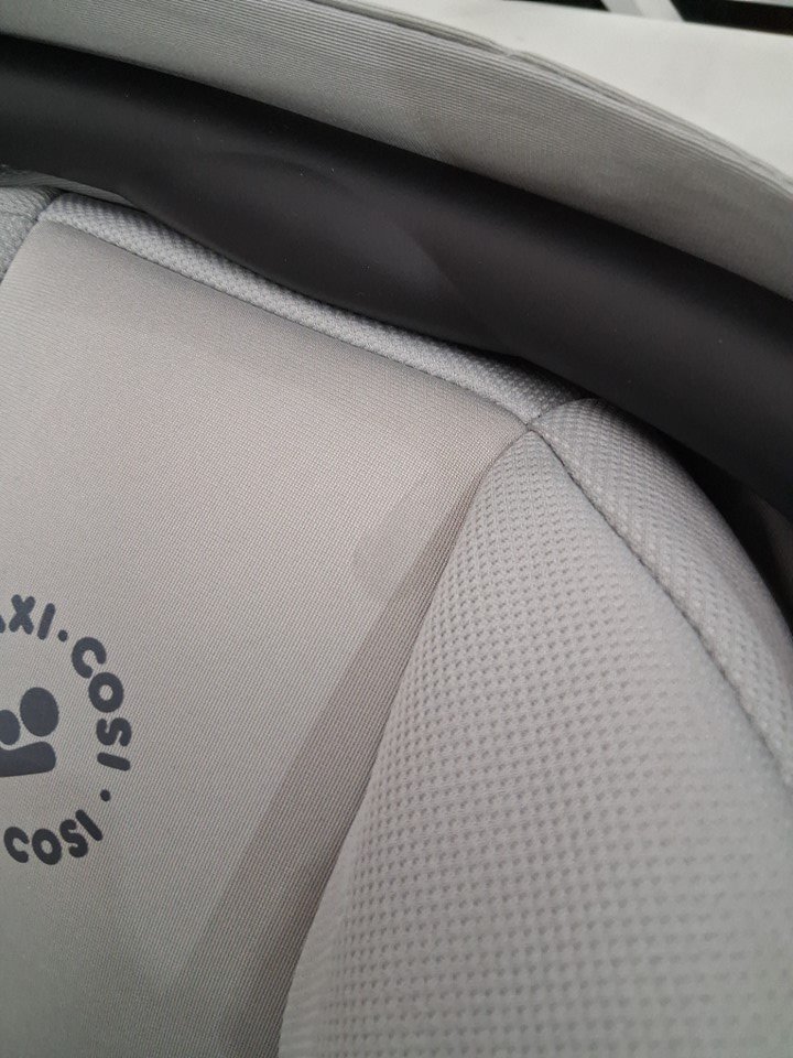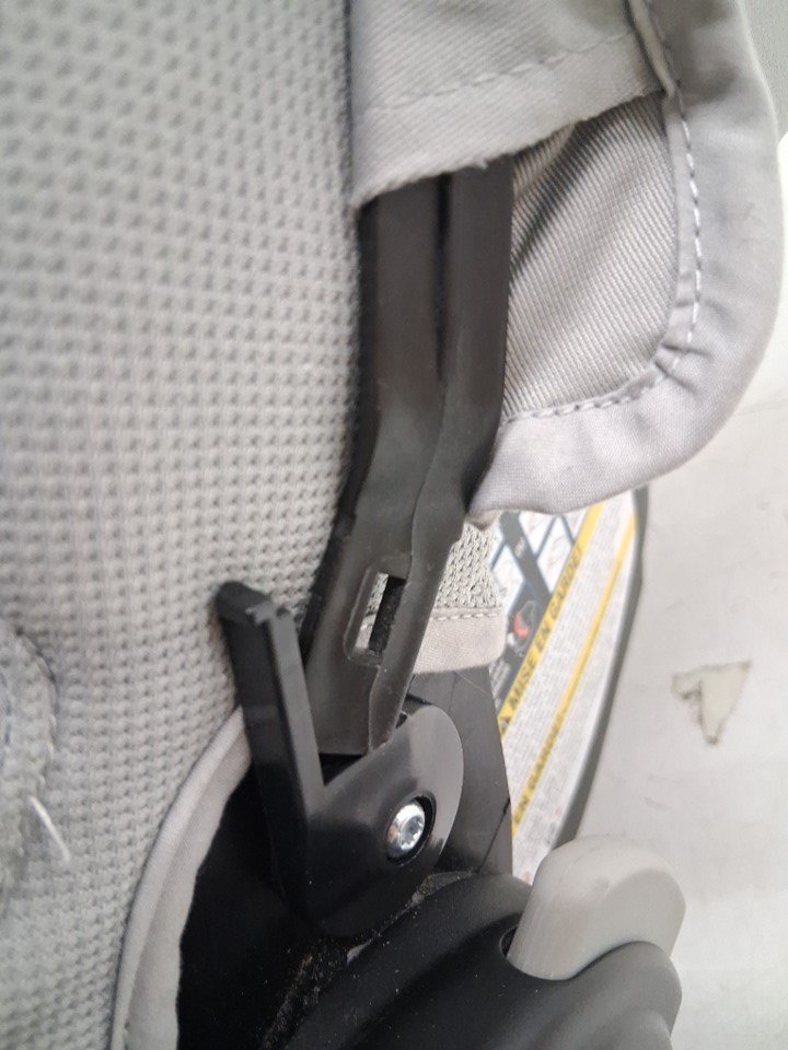 Sun visor arm partially broken. Seat has small stain near top. Unit shows signs of prior short-term use. (See photos)