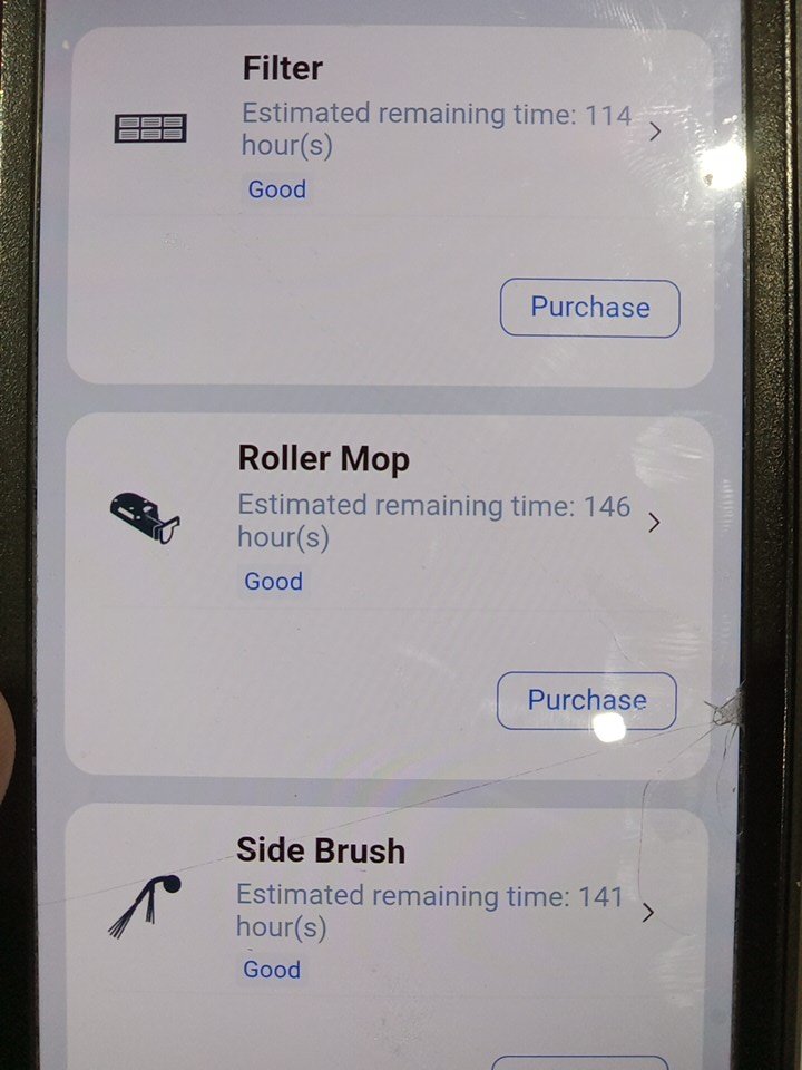 Item tested for power, charging, basic operation, wifi/app connectivity. Item shows signs of being previously used prior to being returned. There is dust/debris on both the vacuum and the base station. There are also some light scuffs/scratches on the robot vacuum and some slight wear on the brush, side brush and mop roller. Please see attached photos for everything included with the item as there may be some missing accessories.