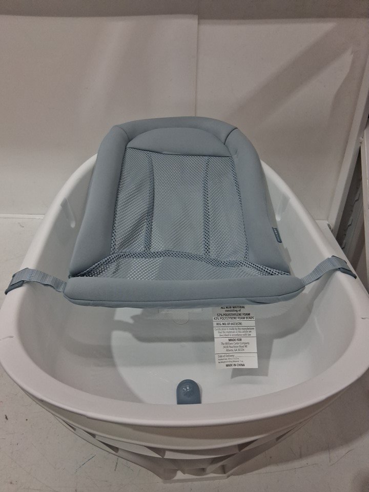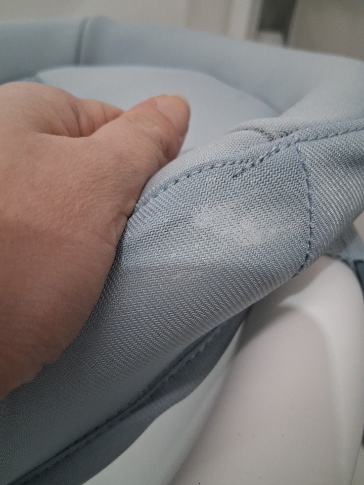 Has a white spot on the fabric and some minor scuffing on the edge.