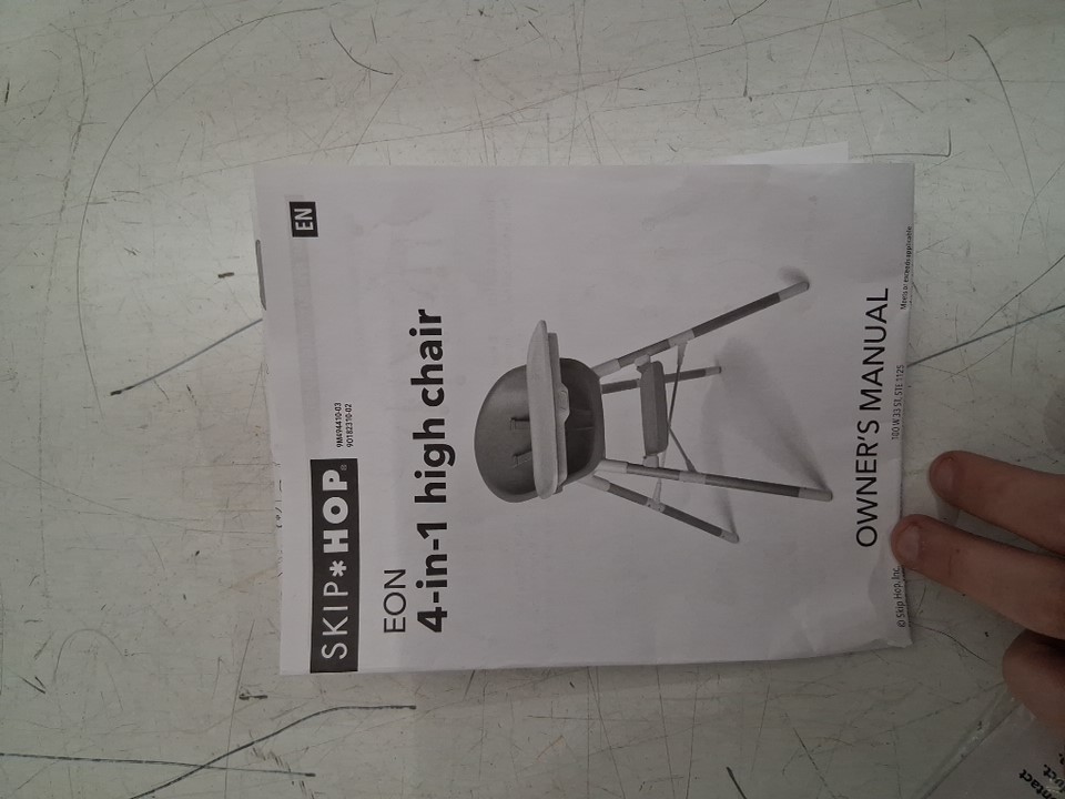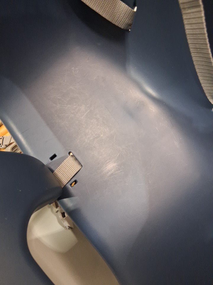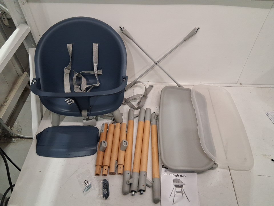 The previous owner only seemed to set up the straps and tray holder, everything else looks new. There are scratches on the chair seat from previous use/shipping.