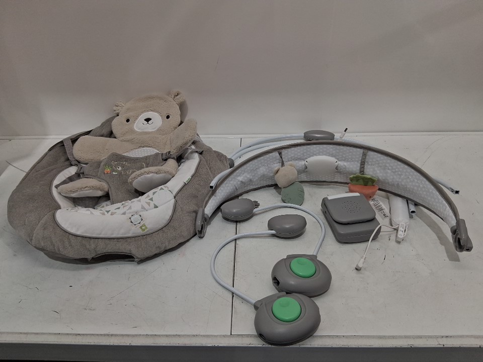 Ingenuity InLighten Baby Bouncer Seat with Light Up Toy Bar and teddy Bear Tummy Time Pillow Mat - 20LBS MAX - grey (model: 16667-000)