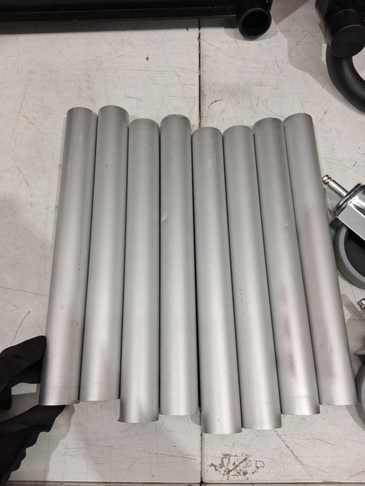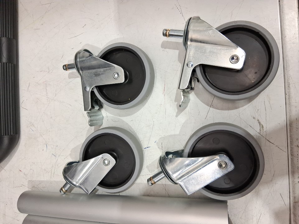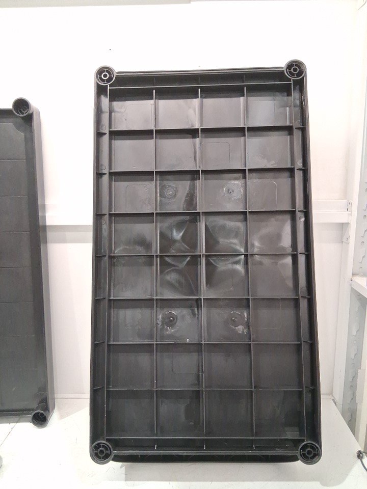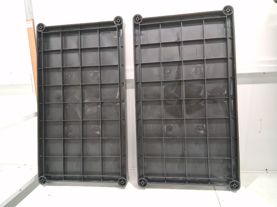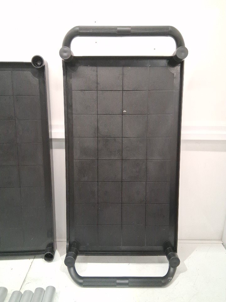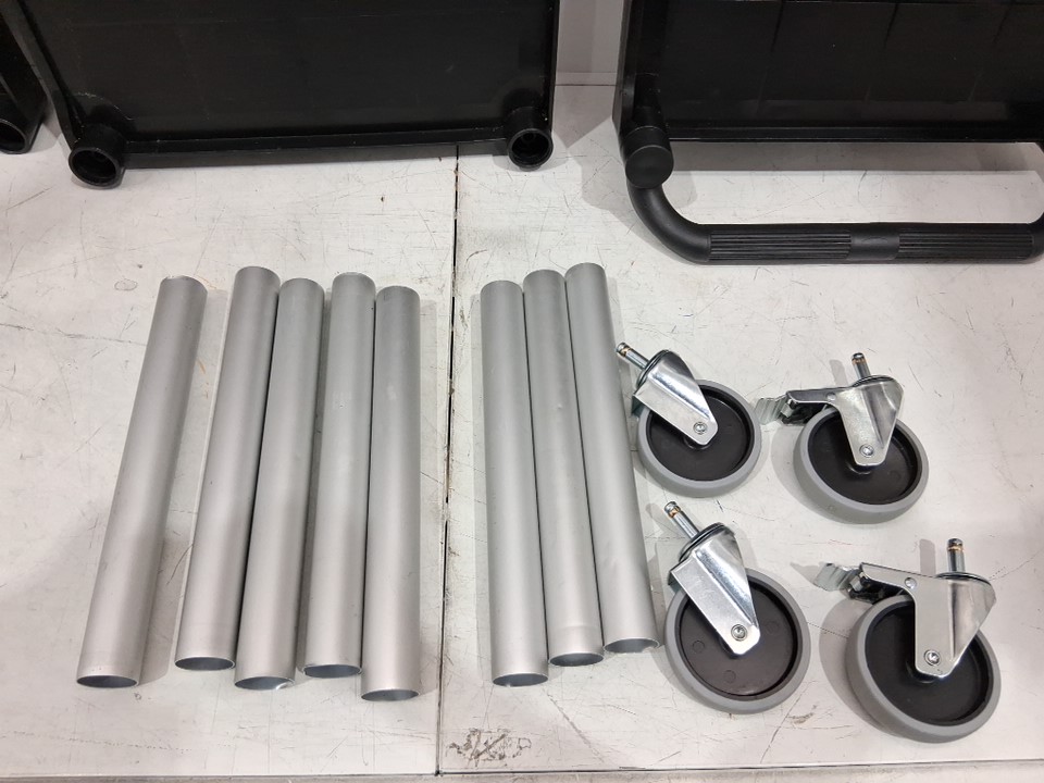 The manual is missing from the original packaging. One of the shelf bases has a minor crack, but it does not affect the product’s functionality. There are scratch marks on the poles. There are minor water and dirt stains on the top surface due to previous use. (Please see photos)