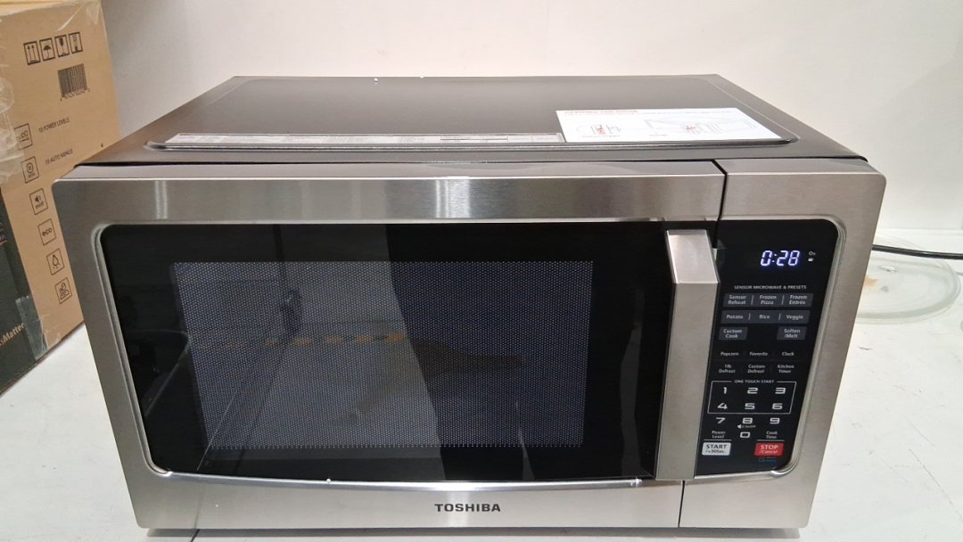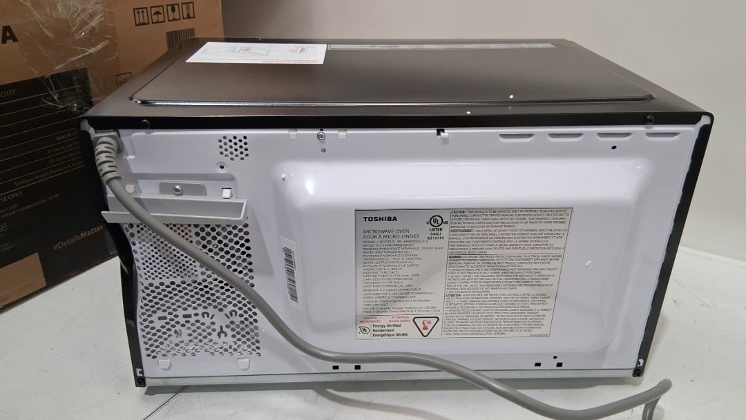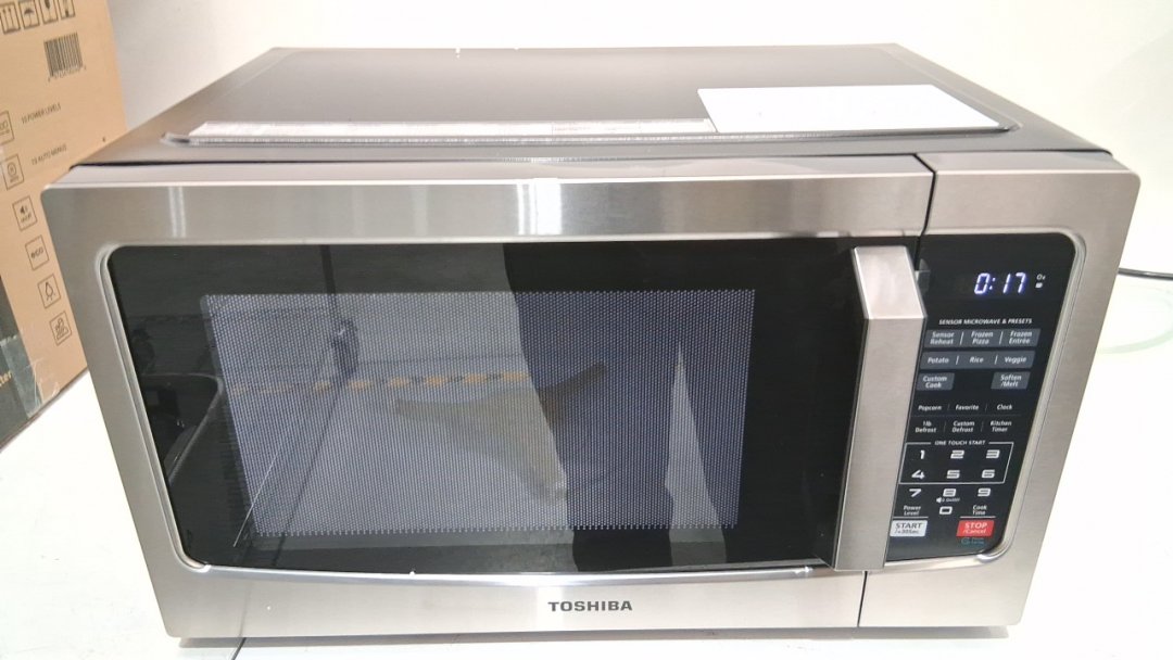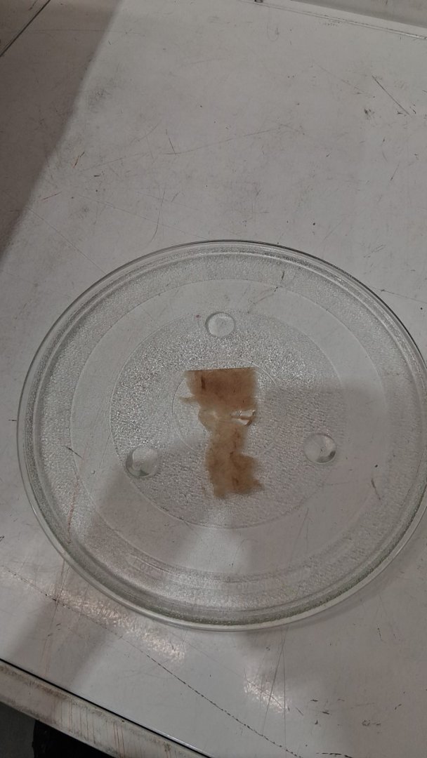 the microwave plate has tape residue on it, will need to be cleaned before the microwave can be used. The microwave is also bent due to shipping. tested for power