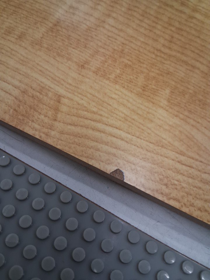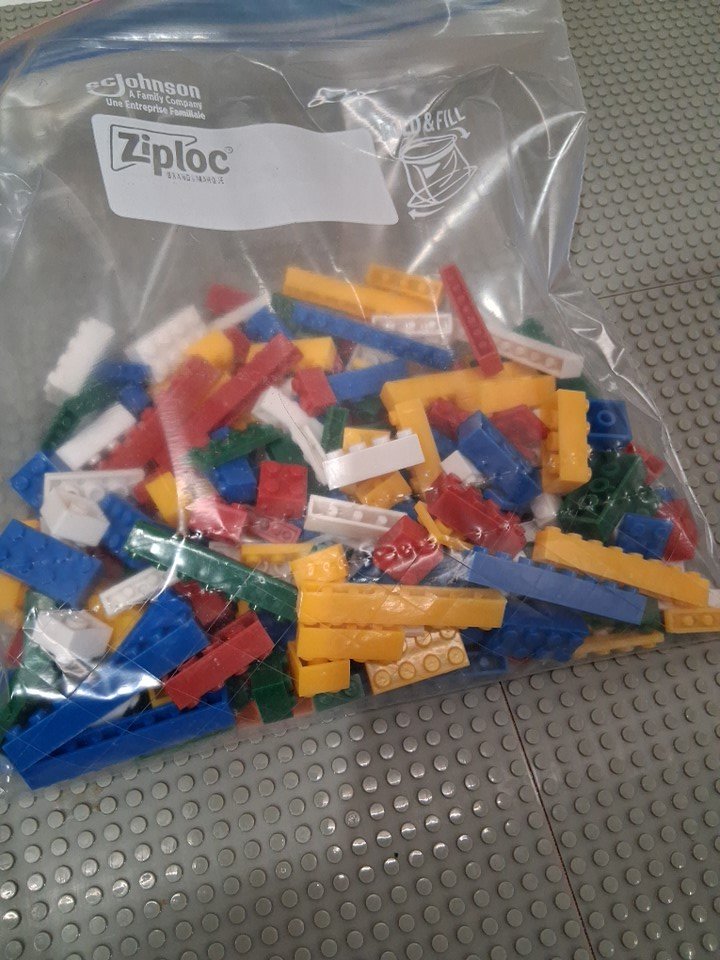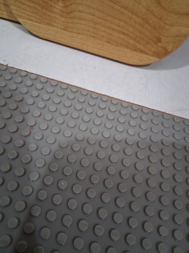 Missing the inner square wooden piece and some building blocks. Has some chips in the surface of the wood and some residue on the lego surface.
